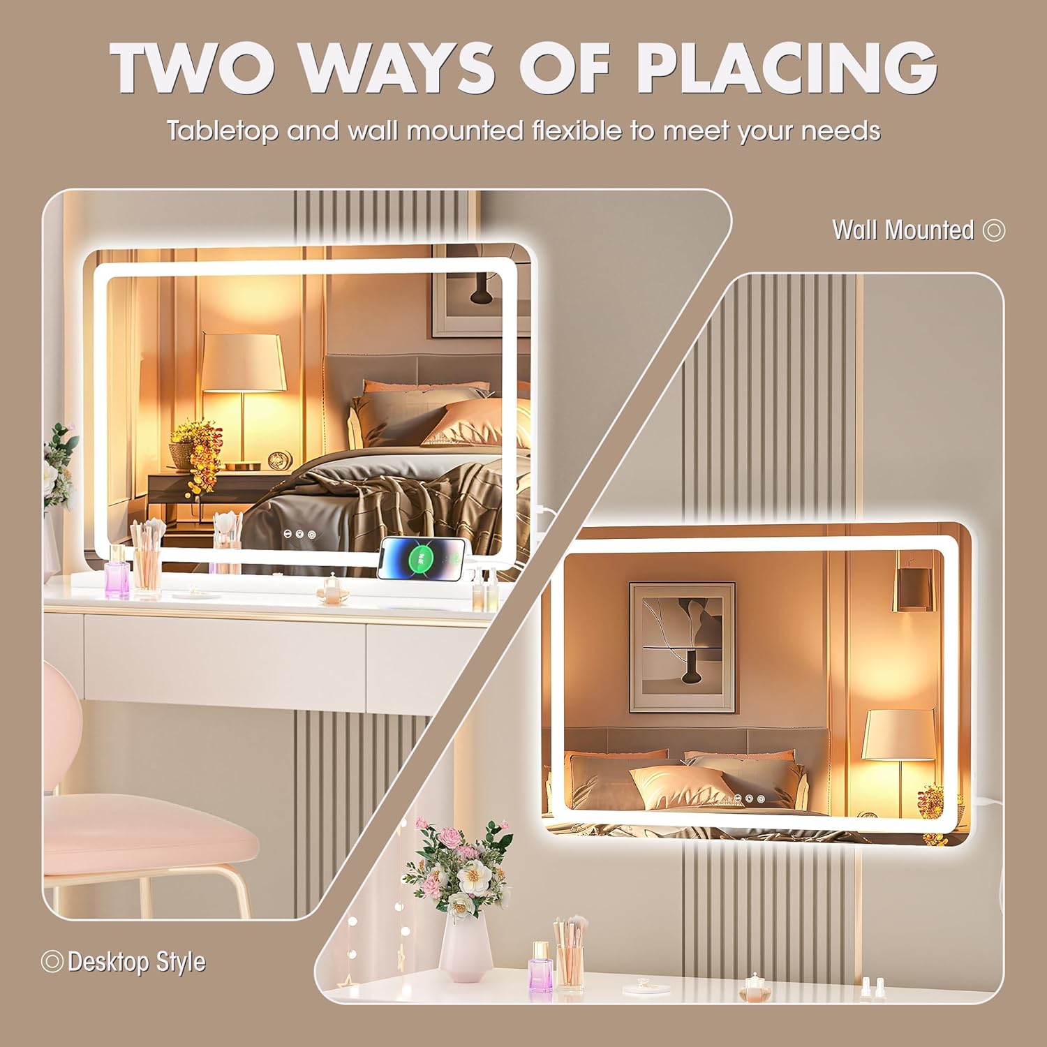 - 👍【Smart Touch Control & Memory Function】This makeup mirror with lights has 3 smart touch buttons, turn on/off the light by touching the sensor switch, Press left button to change the color modes, long press right button to adjust the led brightness. This lighted makeup mirror is specially designed memory functionfunction keep your lights setting like your last use.