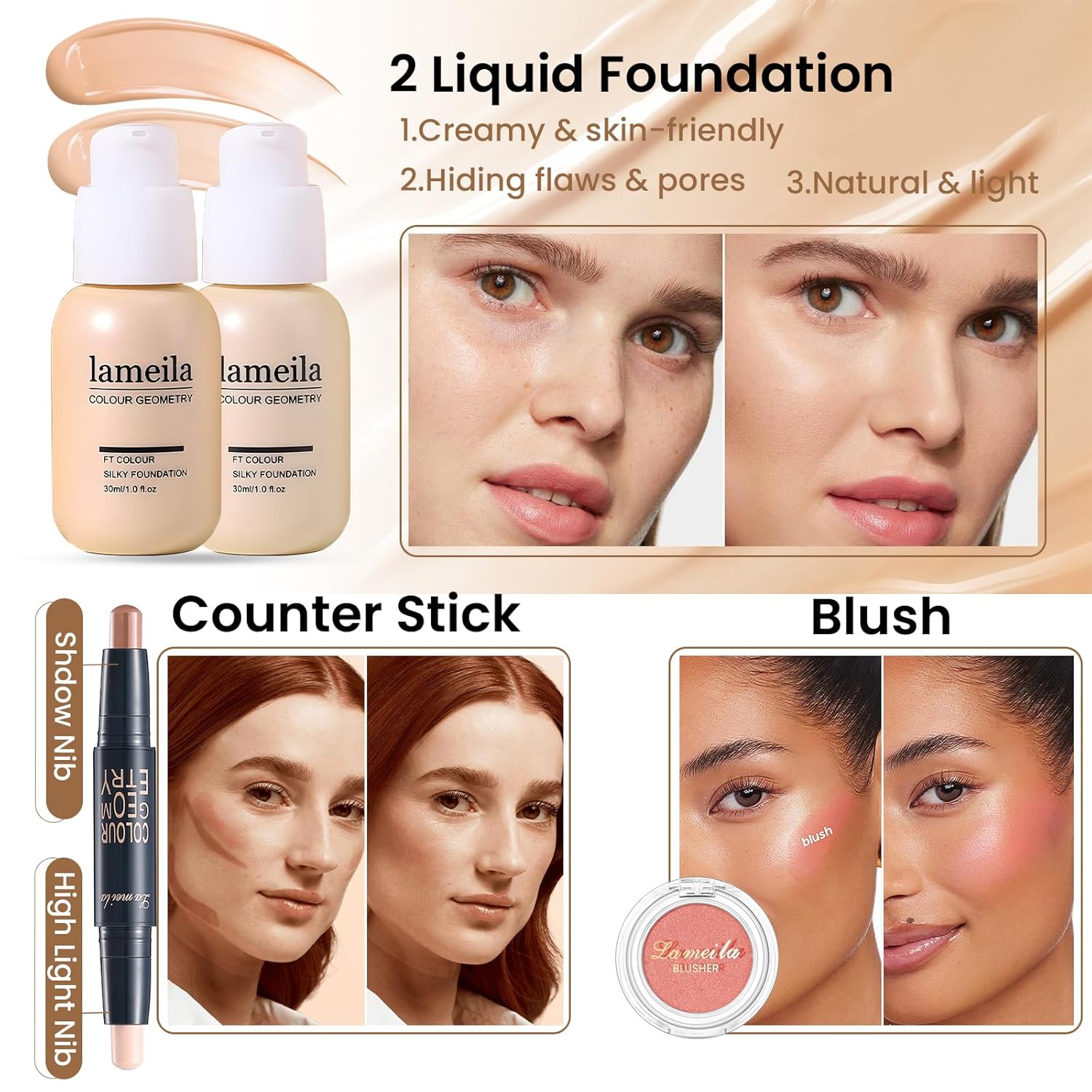 - 【Makeup Kit for Women Full Kit】This makeup kit for women includes 2 14-Color matte & shimmer eyeshadow palette, 2 liquid foundation, 1 counter stick, 1 blush, 3 lip gloss, 1 waterproof mascara, 1 eyebrow pencil, 1 eyeliner stamp, 8 makeup brushes, 2 makeup sponges and 1 cosmetic bag.This comprehensive set covers the majority of your daily facial makeup essentials.