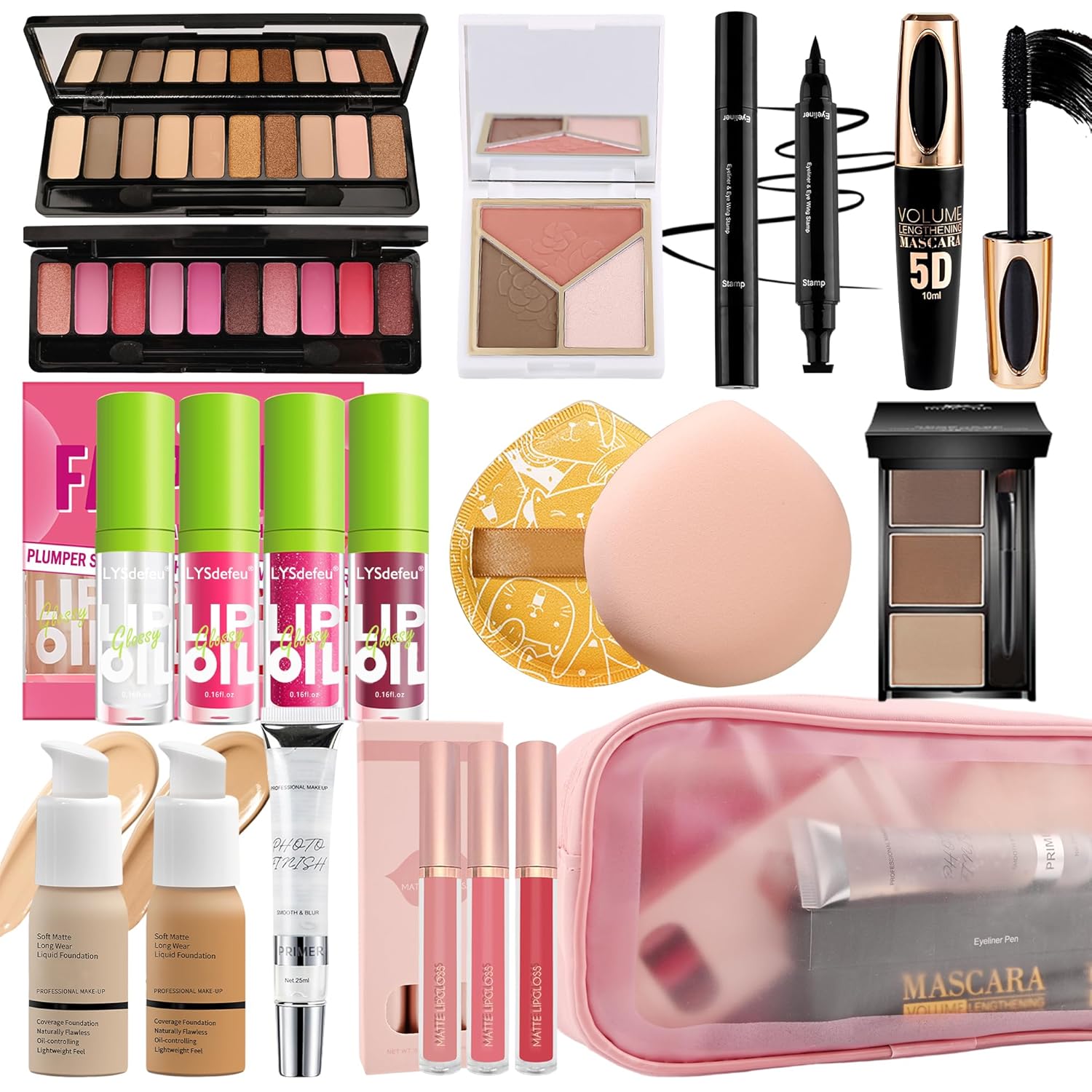 - All In One Makeup Set - Makeup set include 2pcs foundation, 2pcs eye shadow palette, 4 in 1 lip oil set, 3pcs lip gloss, black 5d mascara, black eyeliner stamp pencil, 3 in 1 eyebrow powder palette, 3 in 1 blush & highlighter palette, face primer, 2pcs makeup puff, cosmetic bag. It can meet all the beginners’ or professional makeup artists’ needs for daily makeup.
