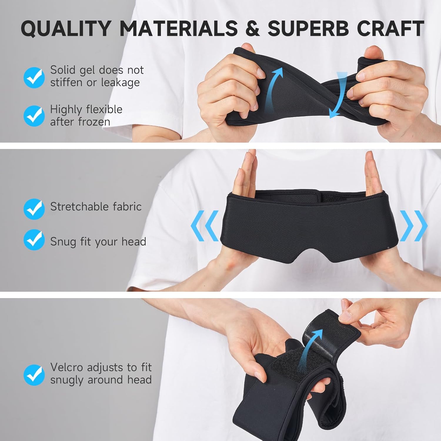 - Why choose Umisleep gel cold eye mask: Crafted to accommodate all face shapes and sizes, ensuring a soft experience. Highly flexible even after freezing, the solid gel remains pliable without stiffening or leaking. Adjustable Velcro ensures a snug fit around the head, while the stretchable fabric enhances comfort