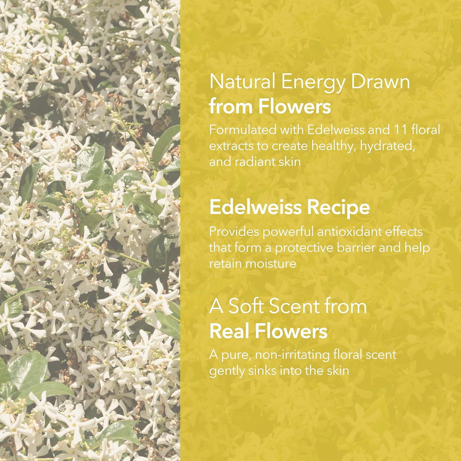 - Naturally Nourishing Ingredients: Powered by Edelweiss and 11 flower extracts. Experience the gentle care of nature as your skin becomes soft, hydrated, and radiant