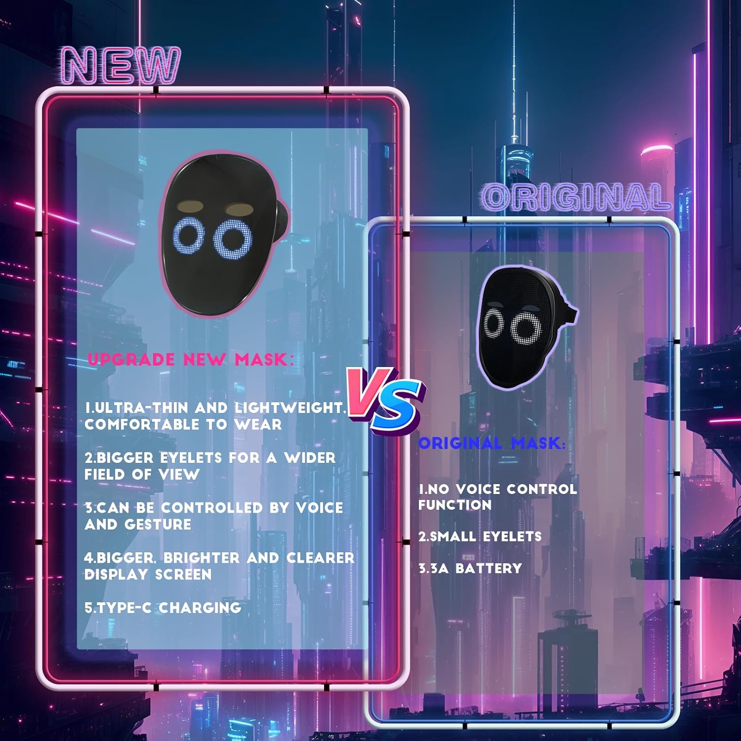 - [Fun and Technological Mask with Voice Recognition]: Some patterns corresponding to words(details in the manual) in voice recognition, this upgrade can better reflect the colorful sense of technology and playability of our MOYACA LED Mask. Voice recognition can be selected to be turned on or off within the app. Our Light up Mask is perfect for any occasion, to make you the center of attention! Come and try something new and share this tech mask someone close to you.