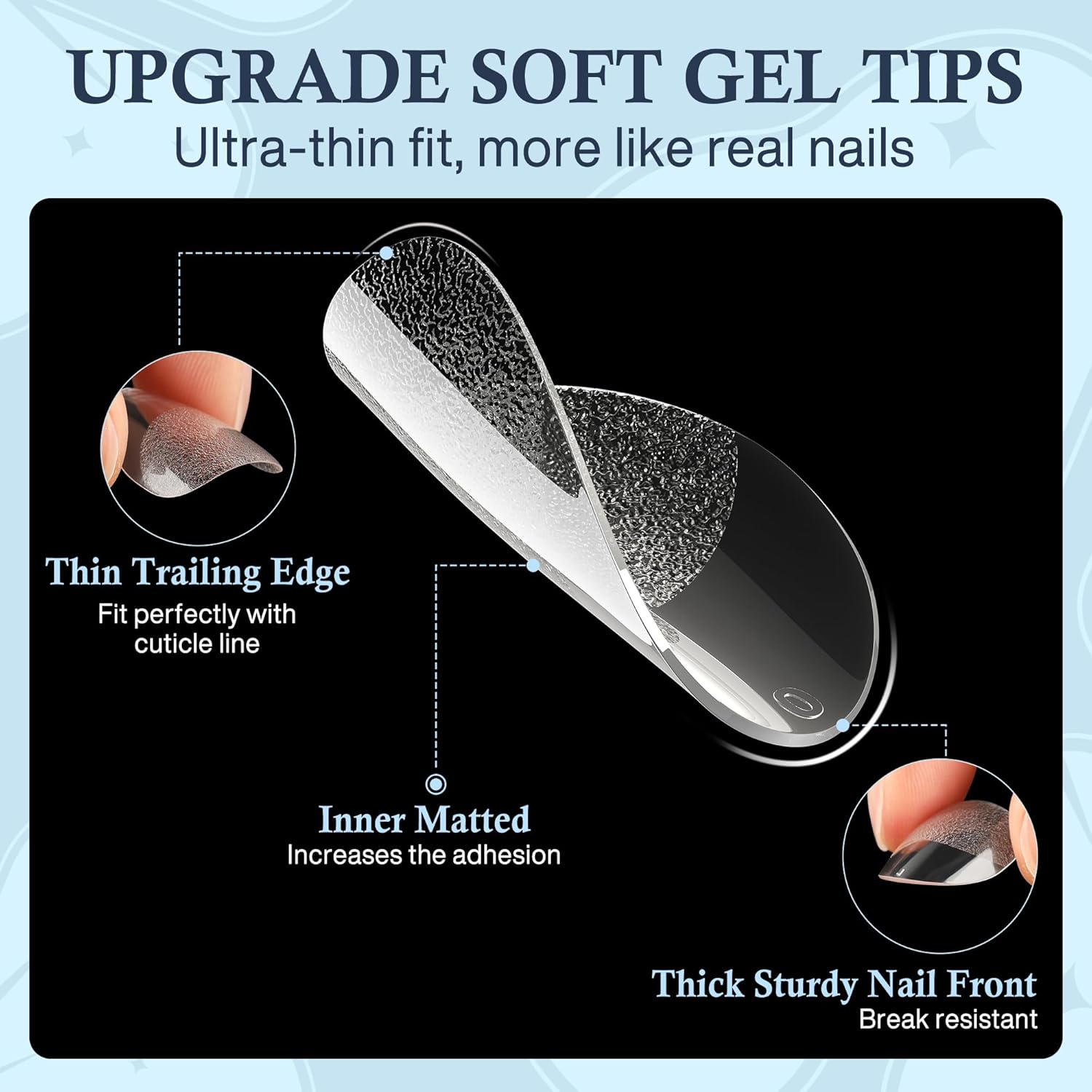 - Foldable Soft Gel Tips: Crafted from gelly soft gel material, these fake nails leave no trace even when bent. Their bright clarity allows for easy pressing, trimming, and painting, helping you create your ideal nail shape effortlessly. Perfect for a true DIY manicure.