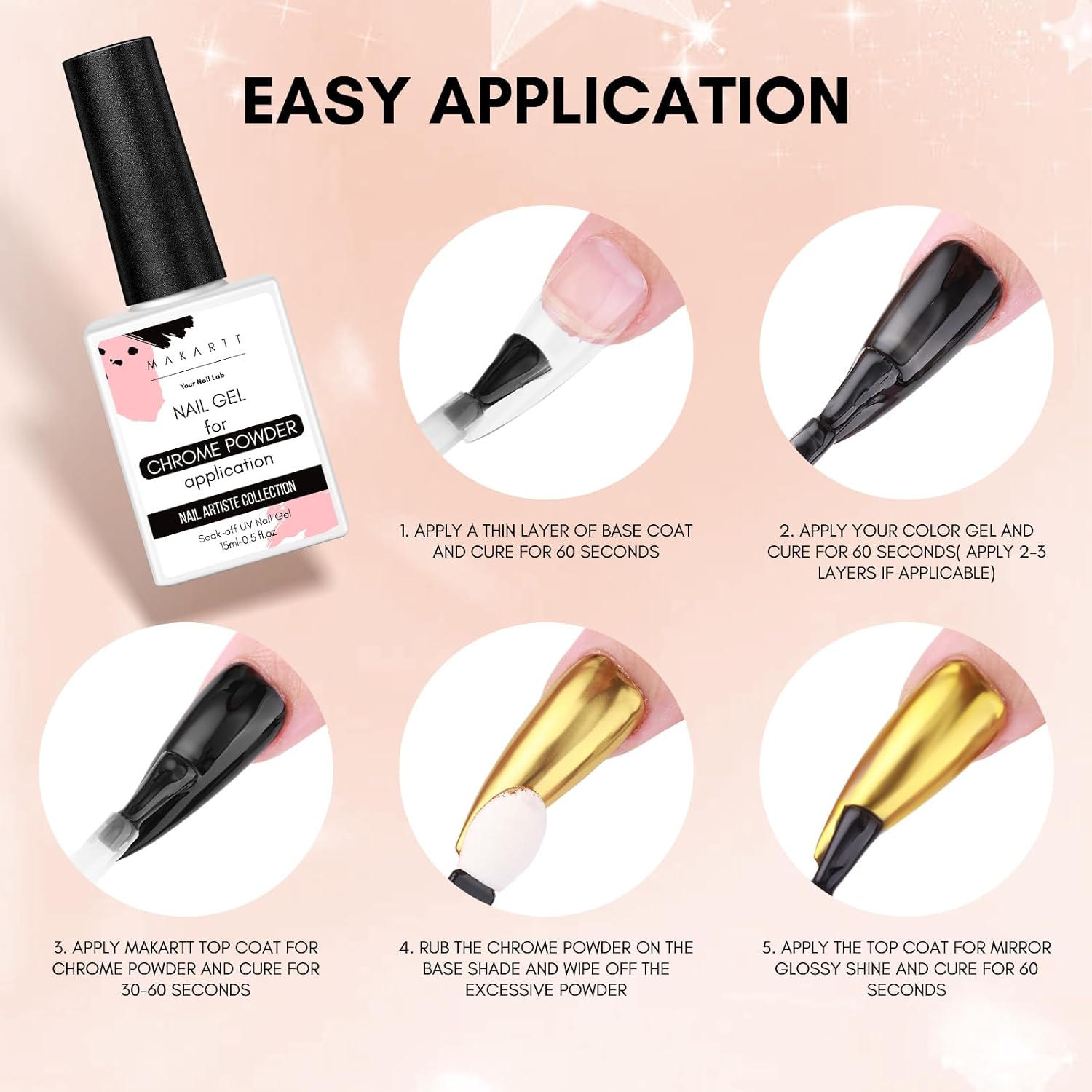 - Easy Application: Simply apply Makartt non-wipe gel top coat over your base color, cure for 30 seconds under an LED UV lamp, and then apply your favorite chrome or pearl powder. Finish by sealing with the top coat and curing under the lamp for 60 seconds to complete the look