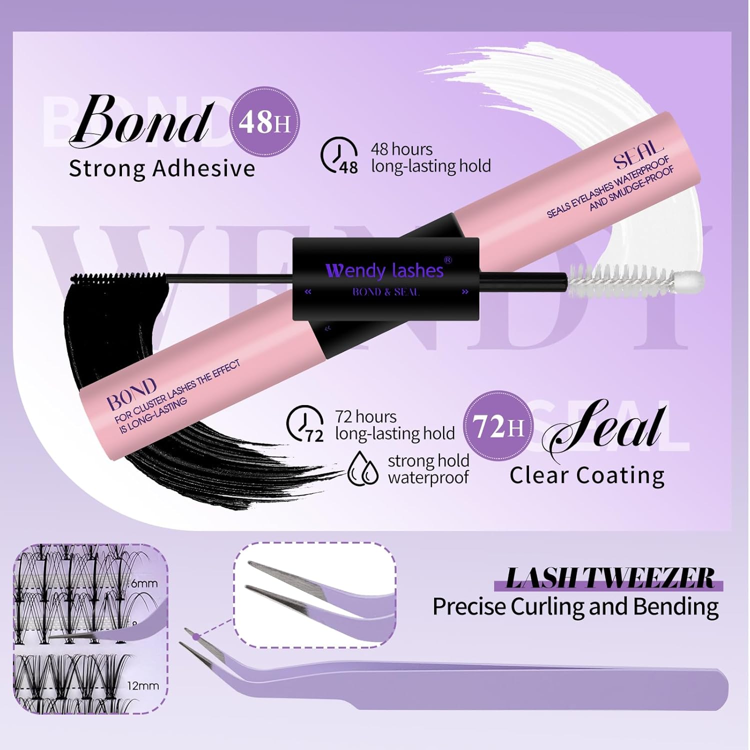 - 72H Lash Bond and Seal: The black side is lash bond, the clear side is lash seal. This lashes glue offers a 72-hour super strong hold and increase the lashes cluster retention by 50%.The lash bond and seal has a excellent waterproof and sweatproof.