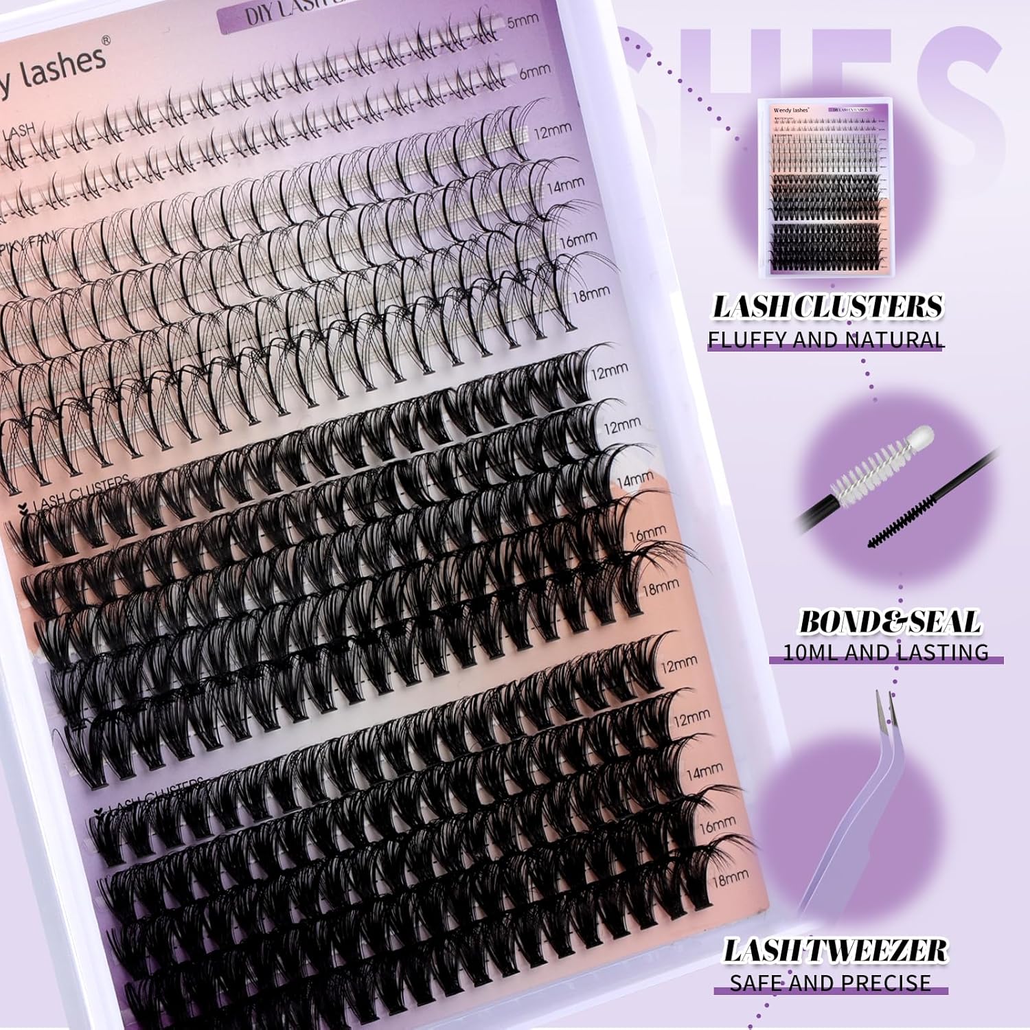 - DIFFERENT STYLES OF COMBO TRAYS: Our lash cluster kits come with four different styles of lashes, whether you want natural or thick, fox eyes or doll eyes, with a mix of lengths ranging from 12-18mm to meet any of your needs.
