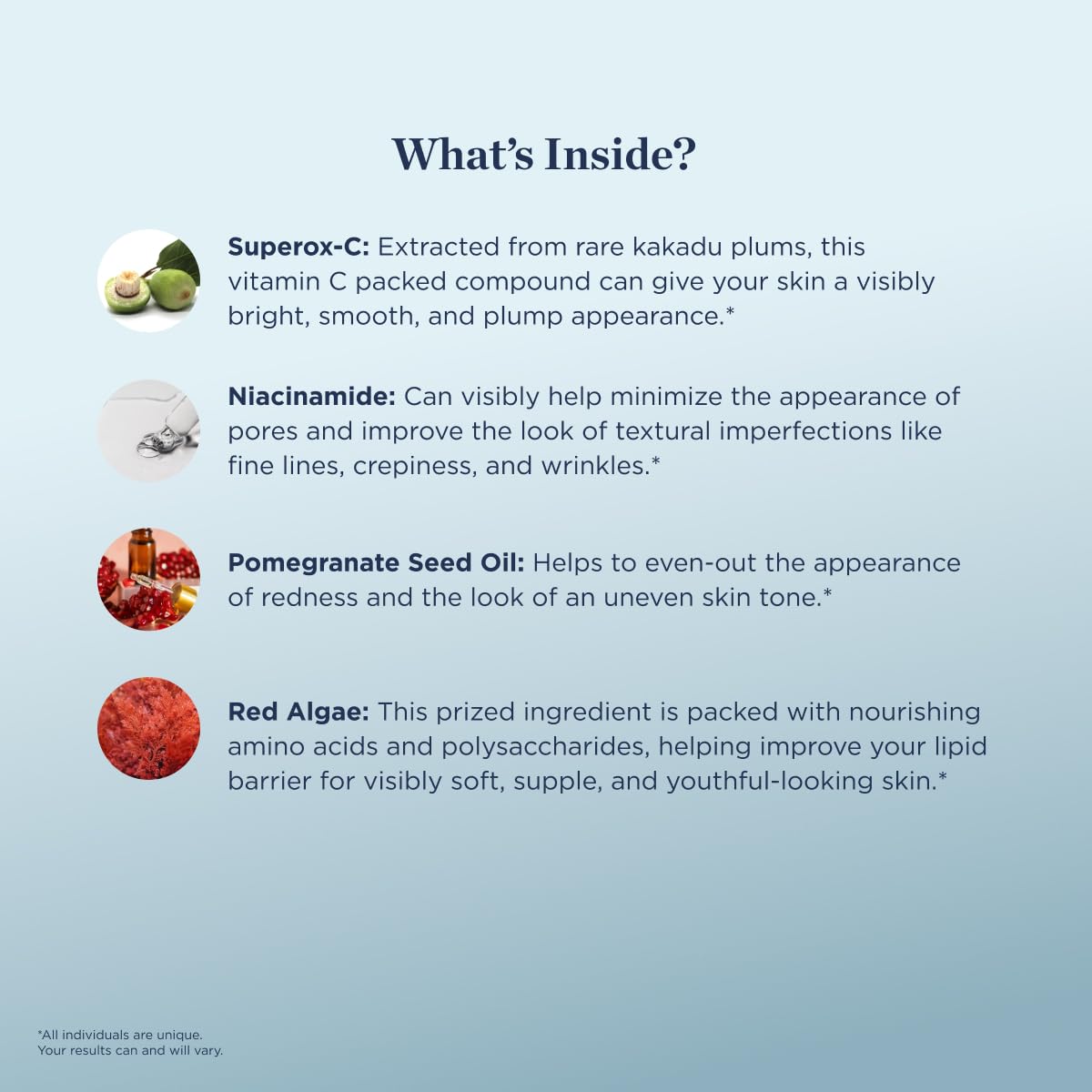 - PREMIUM INGREDIENTS: Each drop is packed with skin-beautifying agents, including Superox-C, Niacinamide, Pomegranate Seed Oil, and Red Algae.