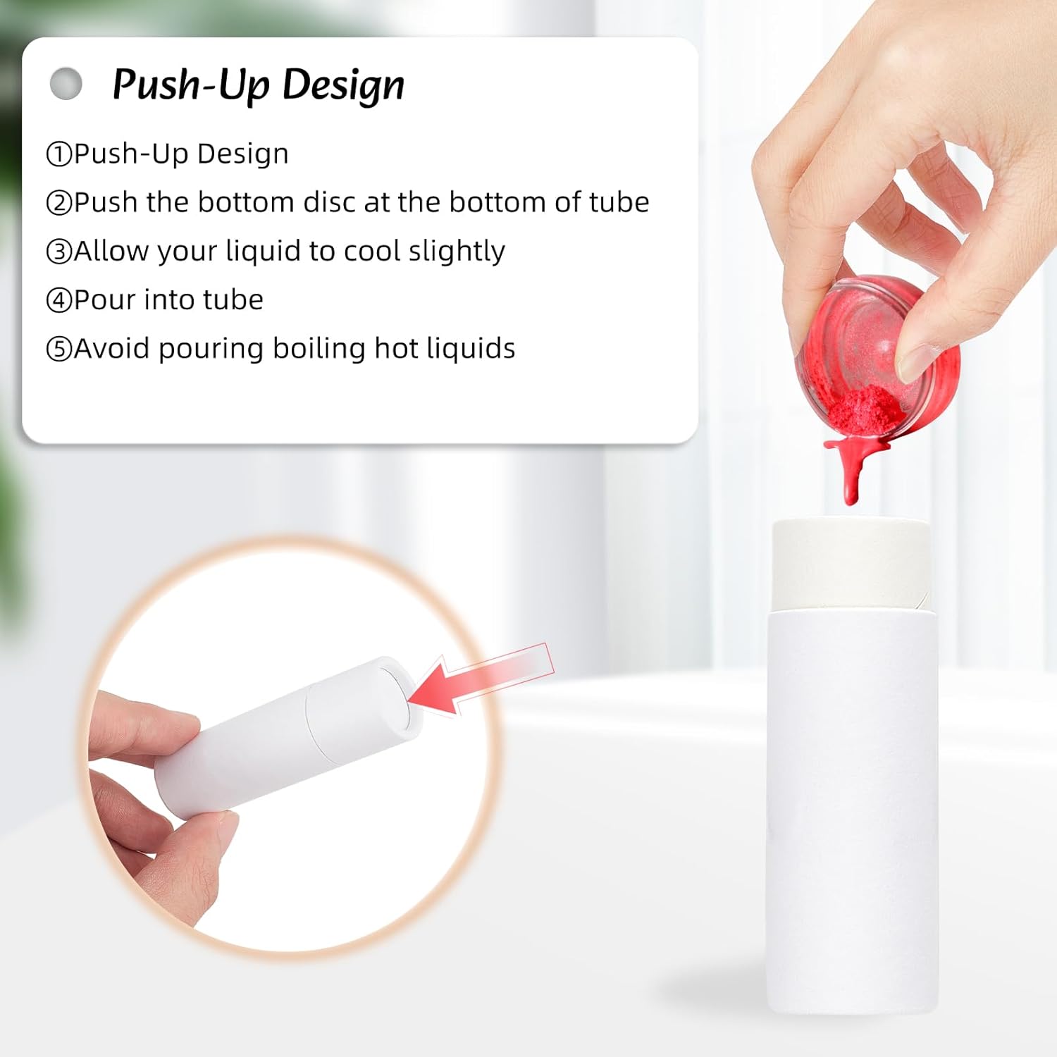 - EASY TO USE: With a unique push-up design, our tubes eliminate the need for traditional twisting bottoms. Simply push the bottom disc upward with your finger to dispense the contents, offering effortless convenience with no worries about leaks.