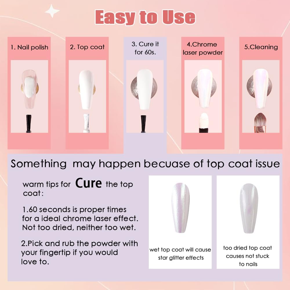 - Easy to Use: The laser chrome powder stuck well to the nails that applied No-wipe Top Coat. You can easily get salon-quality laser chrome results. To make it easy to use the powder, we provide detailed steps and tips in the images. Use it and try more DIY nails with chrome hearts nail charms, flatback rhinestones, and nail stickers.