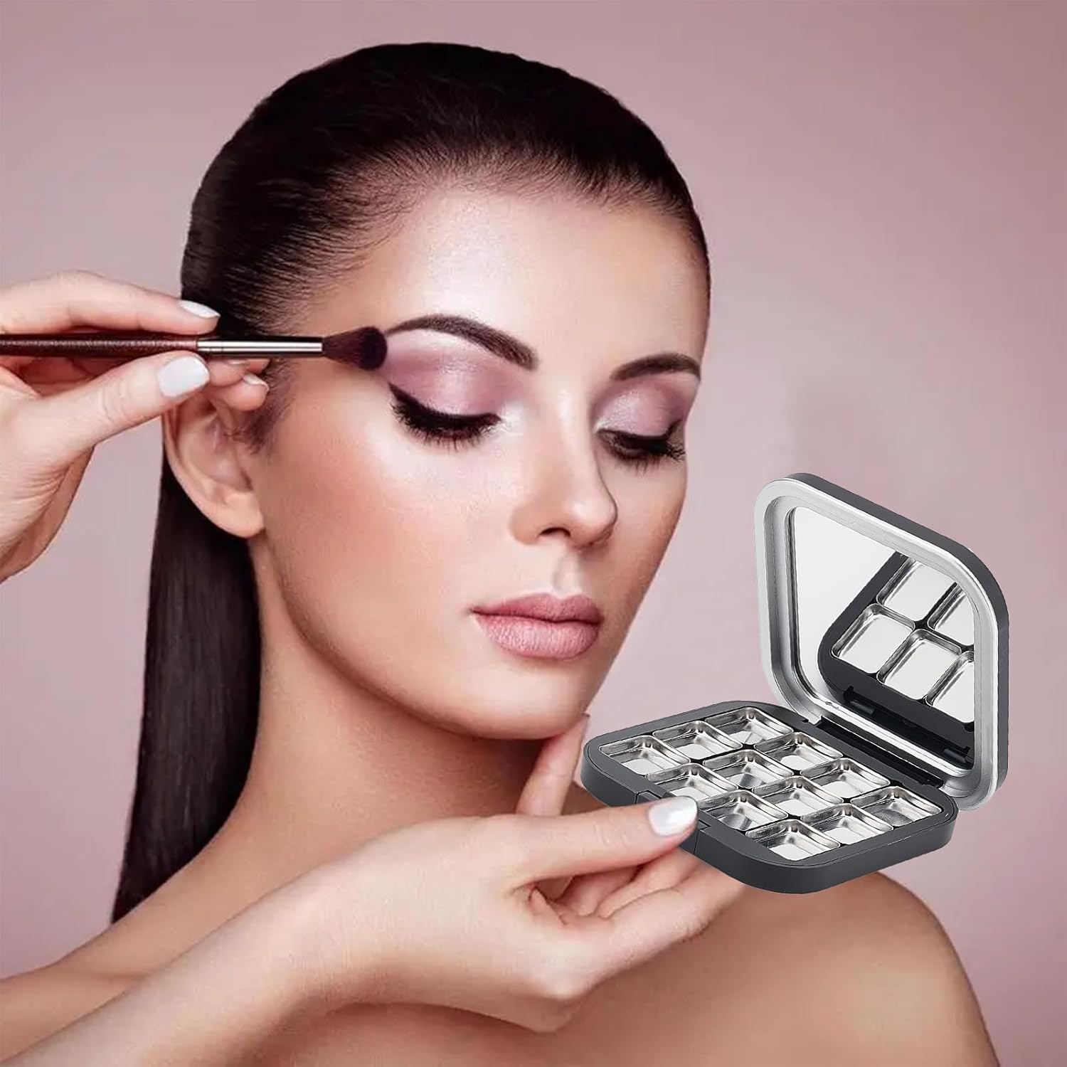- SIMPLE TO USE: The empty eyeshadow palette is a refillable storage case designed with 12 grids to store different colors. Simple yet delicate, it is perfectly sealed to prevent unnecessary leakage.