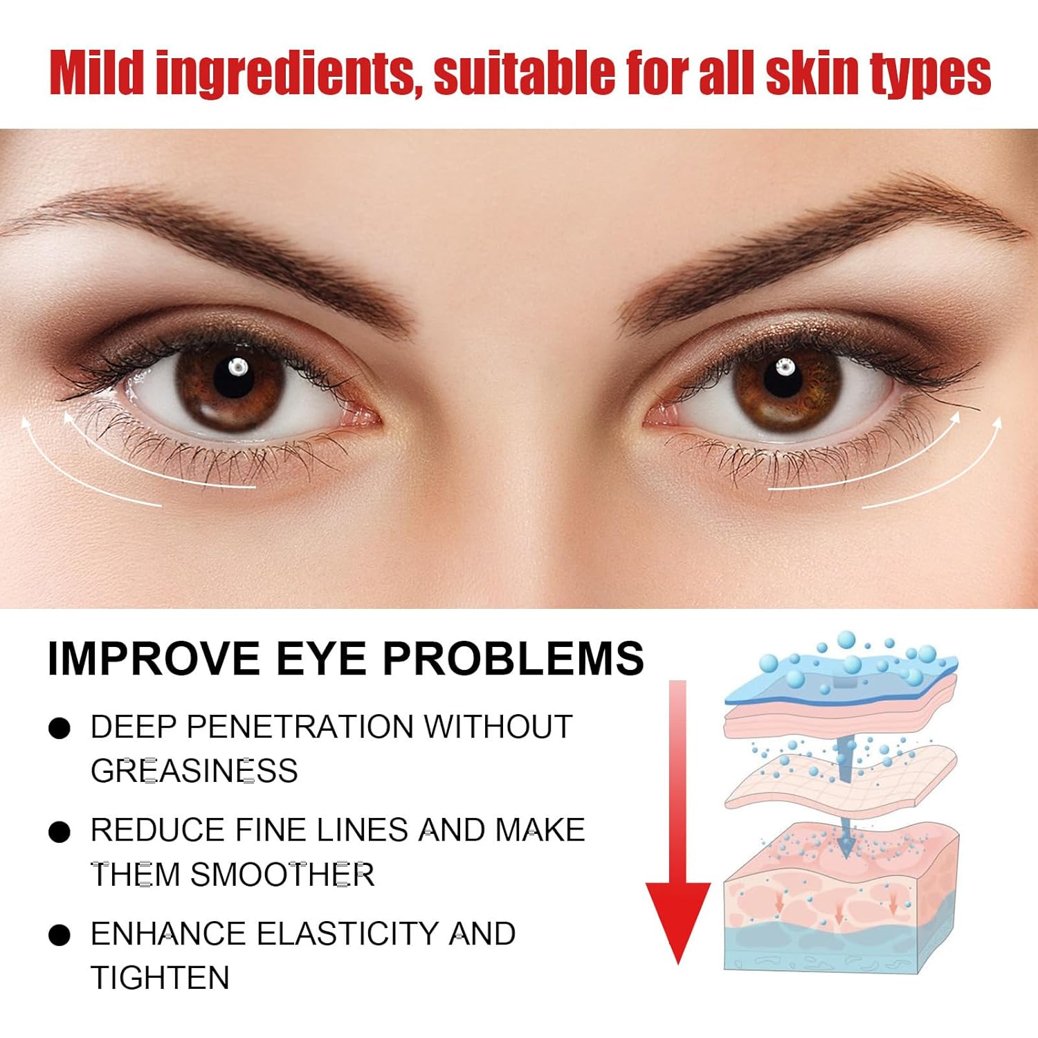 - 【Fresh and Lightweight Texture】The delicate and refreshing texture allows the skin to quickly absorb the eye cream, which is non-greasy and makes your eyes look refreshed, firms and revitalizes the delicate skin around the eyes and locks in moisture.