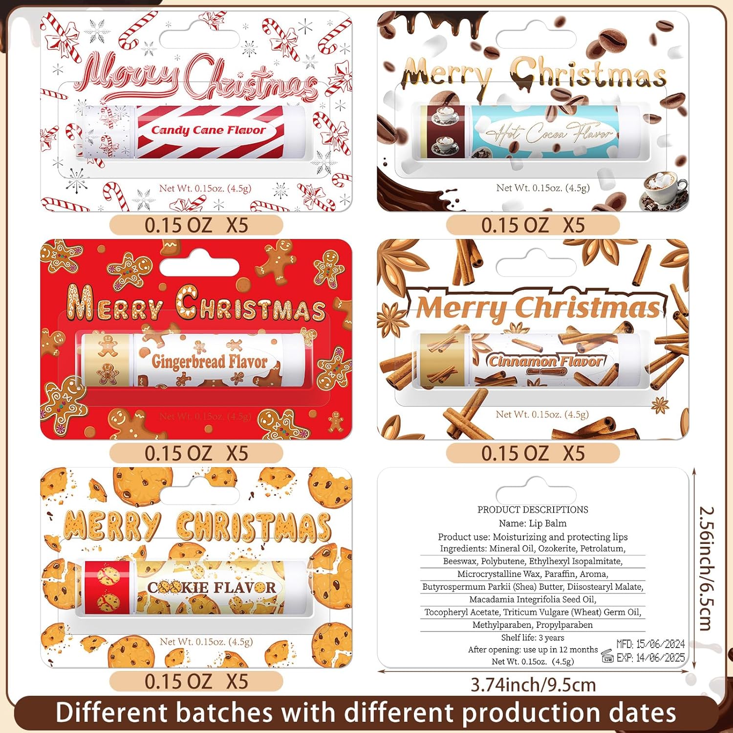 25 Pcs Christmas Lip Balms Stocking Goodie Bags Stuffers Bulk Xmas Gifts Candy Hot Cocoa Cookie Cinnamon Gingebread Biscuits Flavor 5 Style Holiday Treat Small Gifts Party Supplies