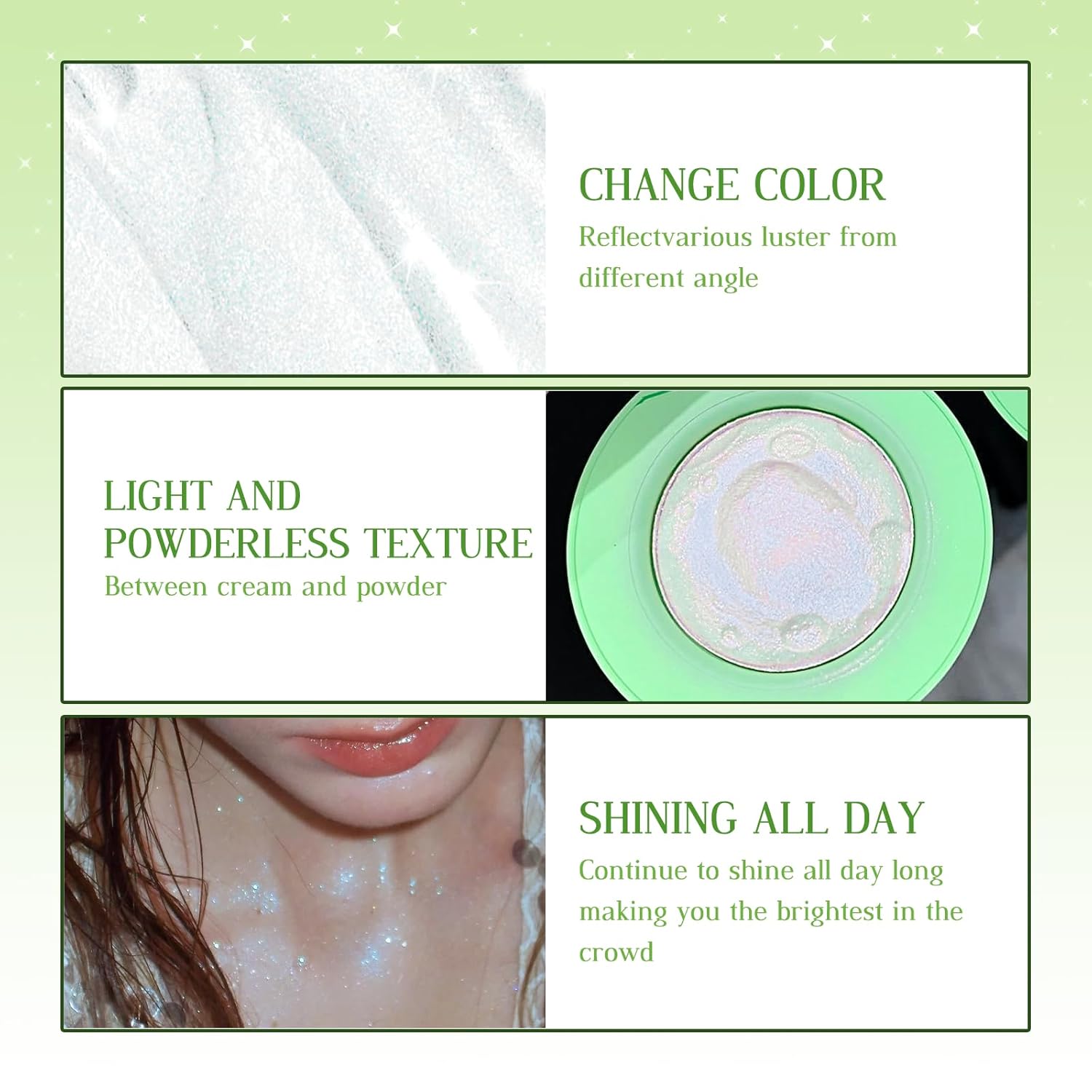 - 【Long Lasting Glow】 Lasting for a whole day that effortless to apply, achieving a diamond-sparkly look, the subtle yet shiny finish of this face highlighter will ensure you stand out in any crowd.