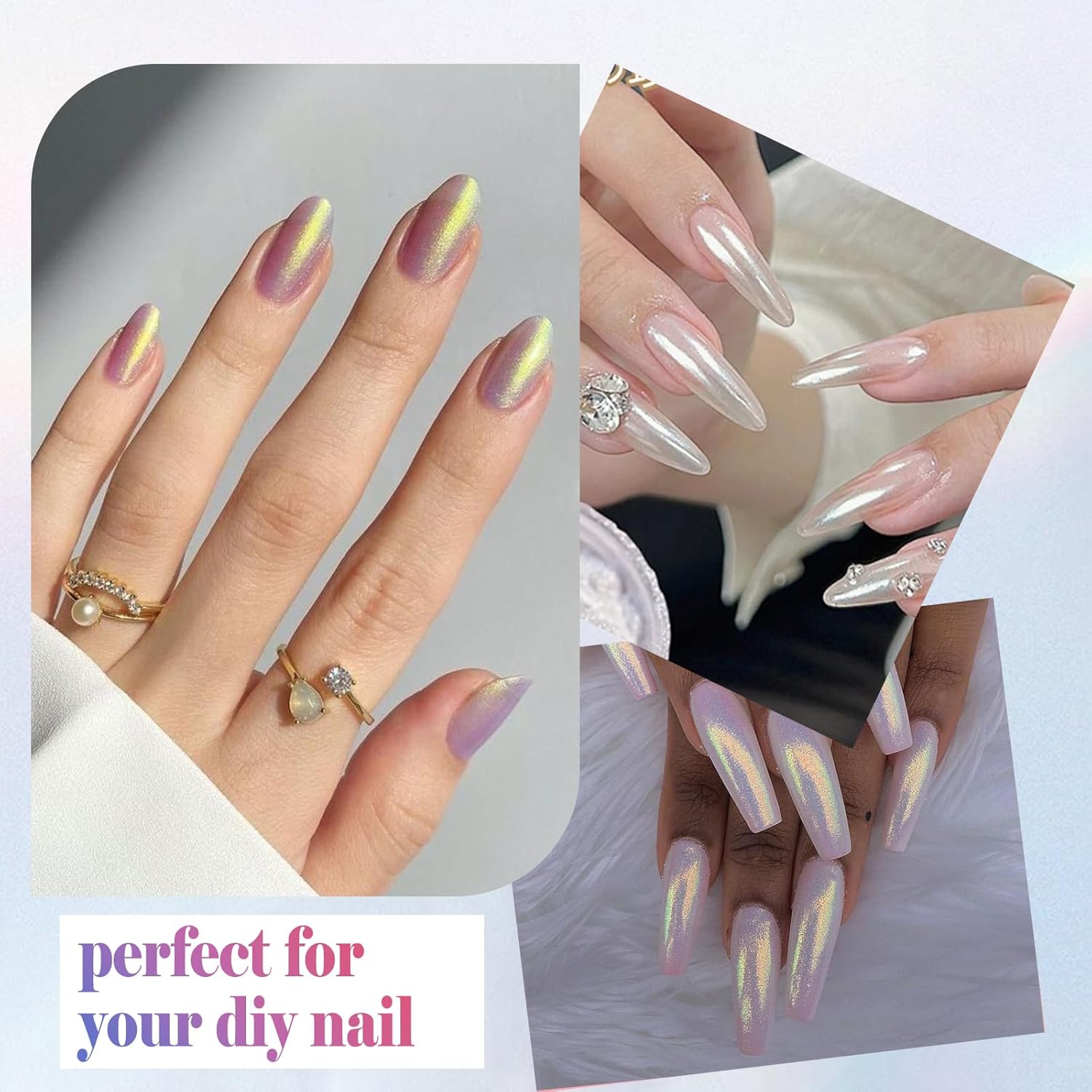 - Strong Aurora Gloss: Our chrome nail powder is a high-pigmented powder and the pearl powder shines like a real pearl, give your nails the look and feel of a fresh white sea pearl when applying on a white gel base. And the chrome nail powder can create different nail chrome effects with various base colors.This ultra-fine chrome glitter is lightweight and non-grainy, which gives you glossy mirror effect.