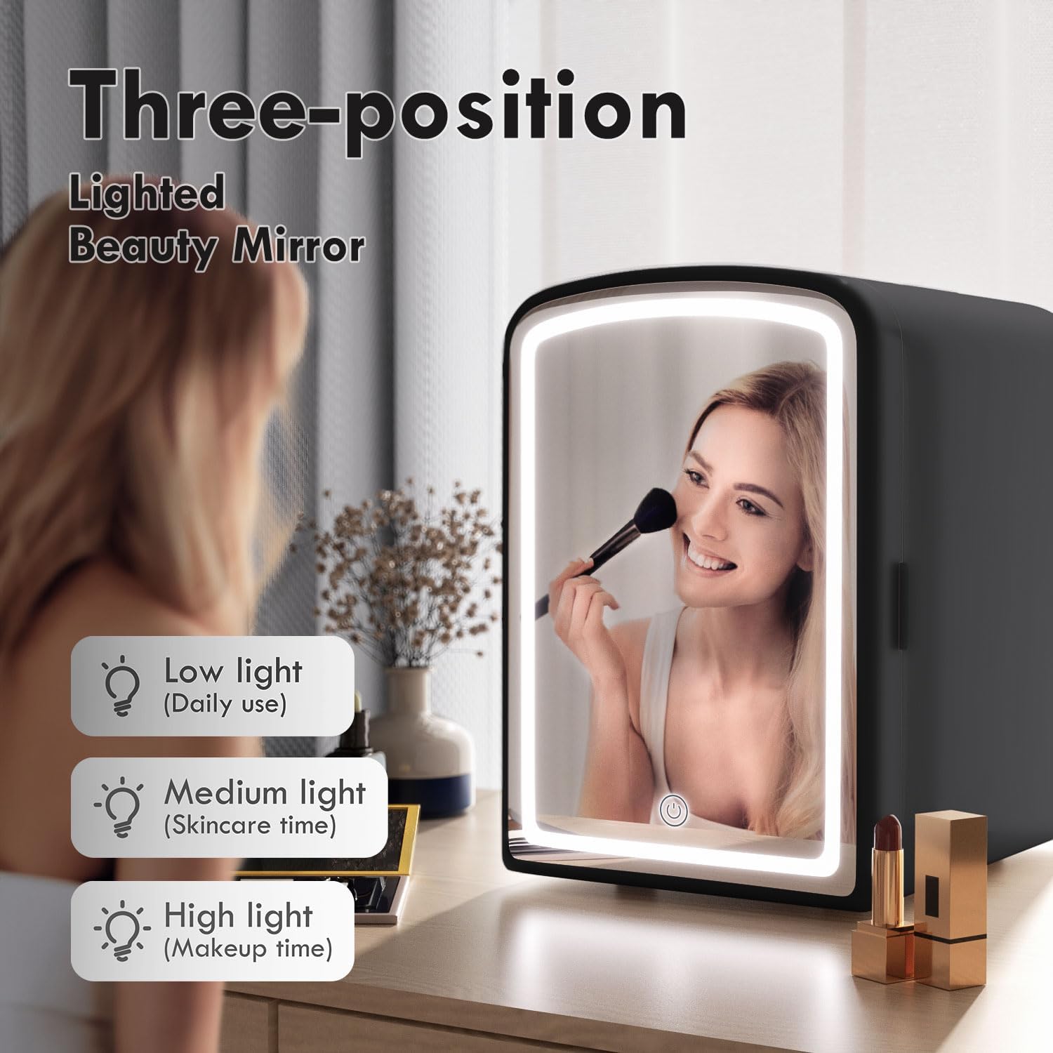 - 【Three-position Lighted Beauty Mirror】- Designed with an extra-large HD mirror and LED lights, this makeup refrigerator adjusts 3 different brightness levels at the touch of a button for different environments and lighting, so you can effortlessly apply your skincare and makeup.