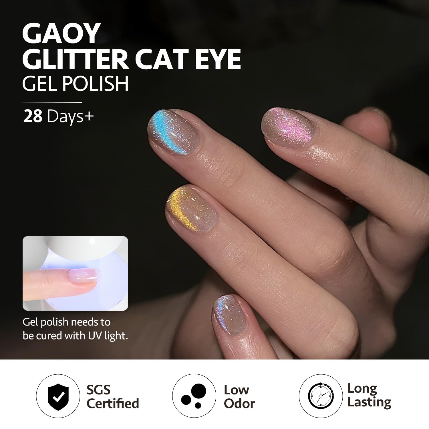 - Glitter Cat Eye: Use the magnet to create desired pattern before curing. Apply gel top coat for gorgeous shimmery and sparkly finish. Heat up in winter to reduce thickness.