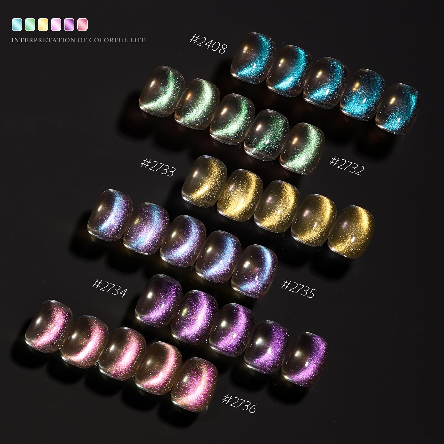 - Package Includes: 6 gel polish colors of 0.25 fl.oz (7.3ml) each + cat eye magnet. Professional gel nail set to enjoy the nail art from the comfort of your own home!