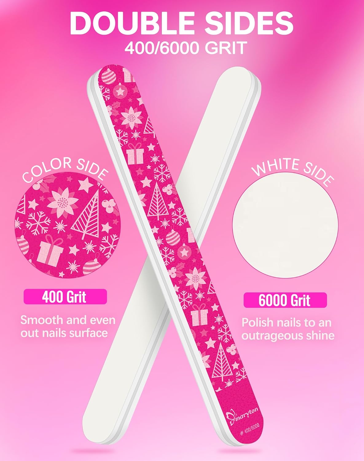 - Easy to Use – Get a smooth glass-shine in seconds! First, use the COLOR side (400 Grit) to smooth and even out nail surface; Second, use the WHITE side (6000 Grit) to shine nails to an attractive shine.