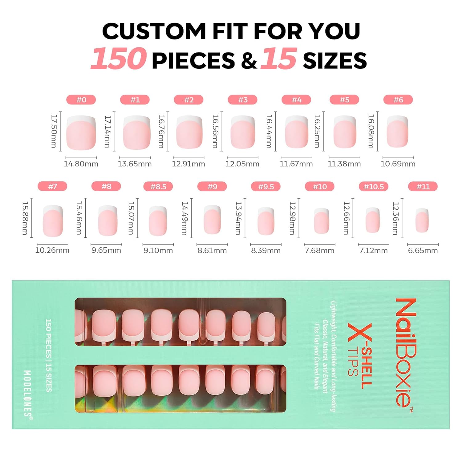 - French Tip Press on Nails Set: Upgraded classic French manicure style kit includes 150 pieces in 15 sizes for a perfect fit on your nail beds.