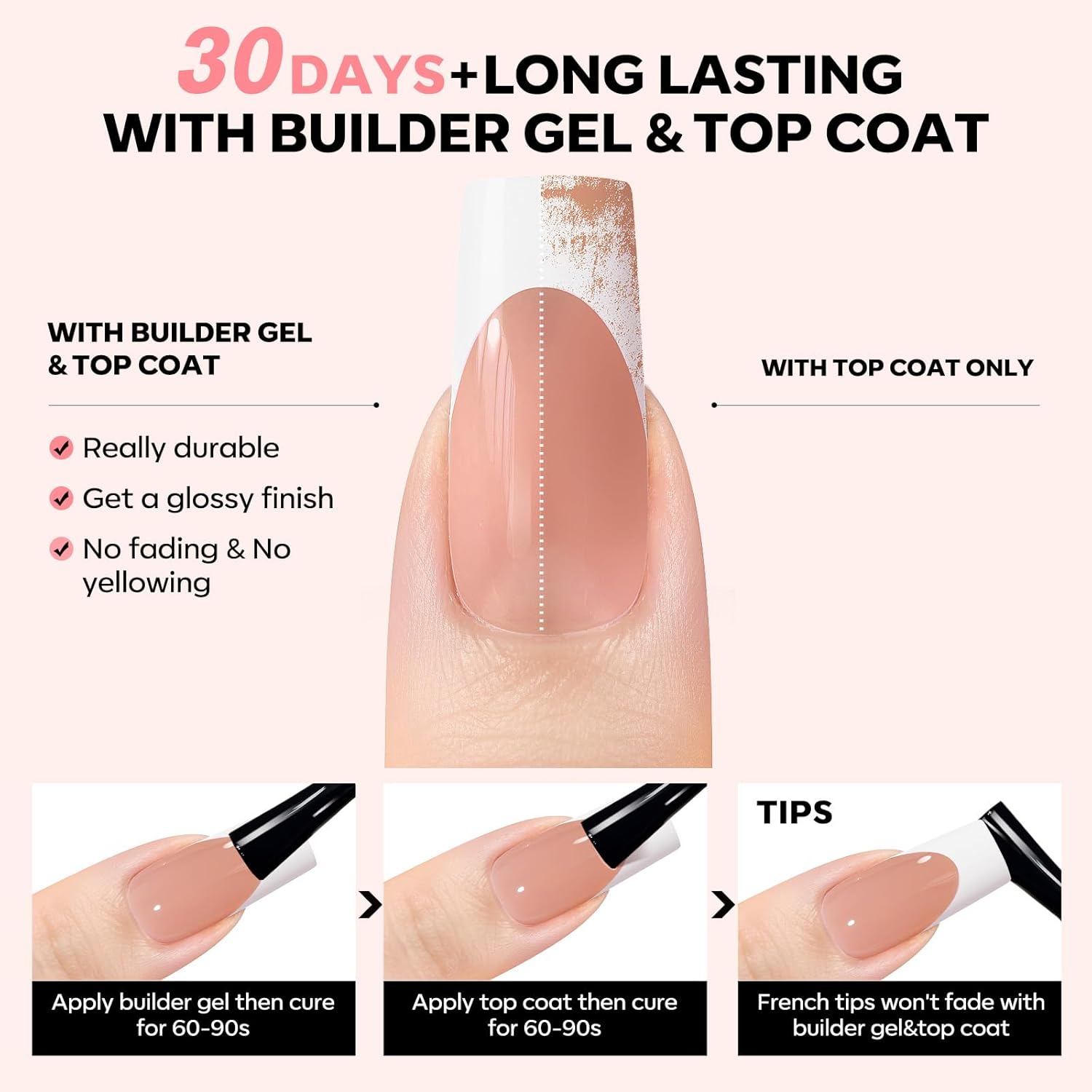 - Time & Money Saver: No base coat needed, just apply glue, complete with builder gel and top coat for professional-grade durability. Easily get salon-quality french press on nails in under 15 minutes and cheaper than salon nails, time and money saving.
