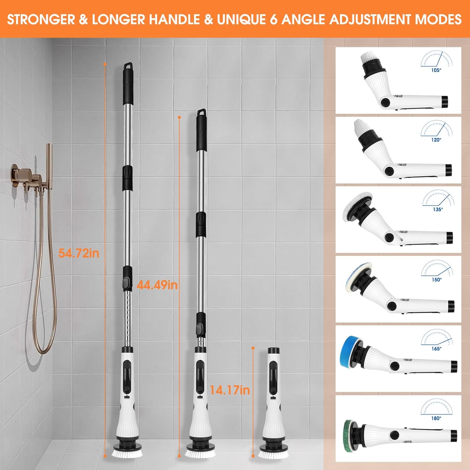 - 【Unique 6 Angle Adjustment Modes & Longer Handle】Spin brush for cleaning bathroom is length 14.56 to 54.72 inches,up to 54.72inches,and has unique 6 angle adjustment modes (105°,120°,135°,150°,165°,180°),can meet all daily needs,relaxed deal with any scene,convenient and labor-saving.The shower brush for cleaning,scrubber and cleaning brush head are easier to store, giving you a better experience