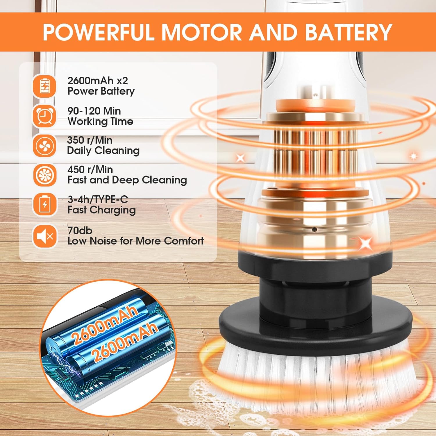 - 【Powerful cleaning performance】With 2 speeds and a max rotation of 450rpm, this 45W high-power power scrubbers for cleaning bathroom effortlessly tackles tough various nooks crannies dirt
