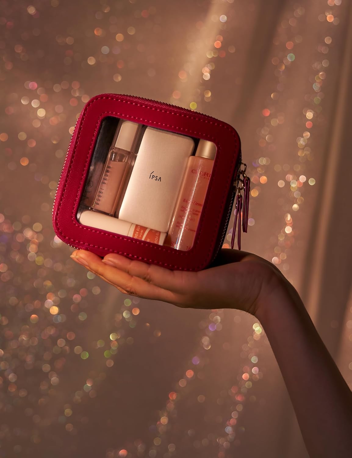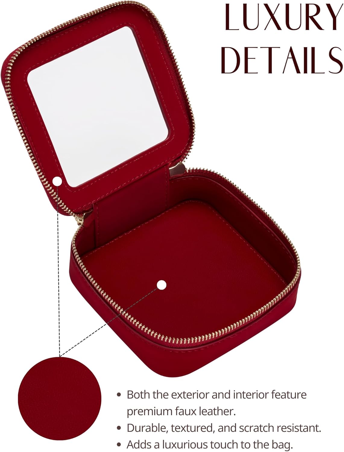 - [Premium Material and Durability] – The clear small cosmetic case, both the exterior and interior, is crafted from faux leather, which is highly scratch resistant, durable and exceptionally easy to keep clean. It features a smooth zipper for secure closure, and elegant light gold metal hardware accents, adding a luxurious and sophisticated touch to the bag's overall design.