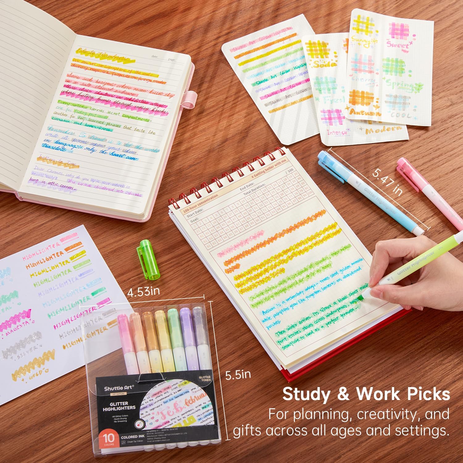 Glitter Highlighters, Shuttle Art 10 Sparkle Colors Chisel Tip Fluorescent Markers, Quick-Dry Non-Toxic Aesthetic Shimmer Highlighter Pens for Kids Teens Adults, Perfect for School Office Art Supplies