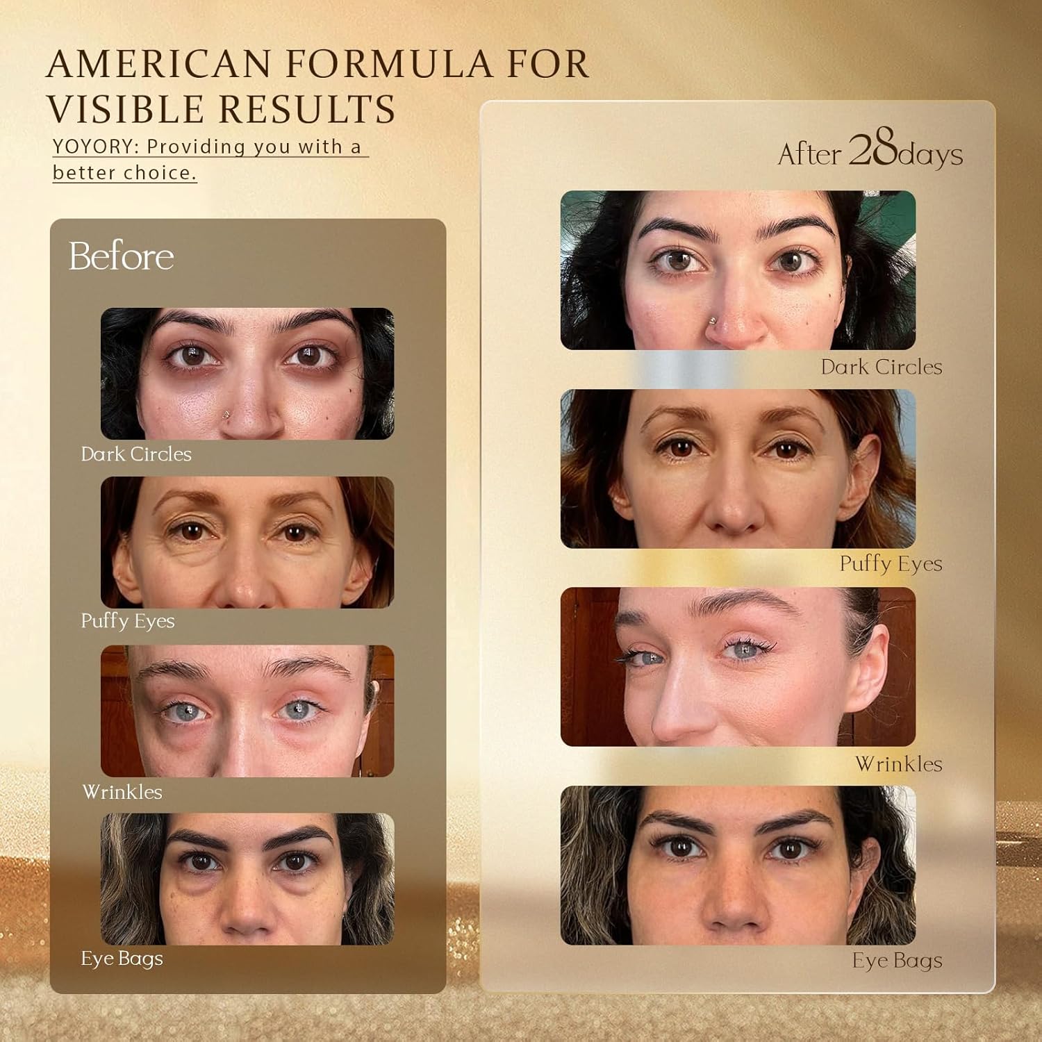 - LUXURIOUS RETINOL CARE: Indulge in the opulence of YOYORY Retinol Eye Cream for dark circles and puffiness, meticulously crafted to elevate the radiance around your eyes. Featuring star ingredients like retinol, this eye treatment creams not only provides intense hydration but also fights free radicals and smooths fine lines with a non-irritating formula, cocooning your skin in a soothing embrace.