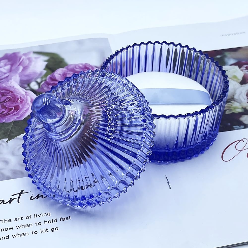 Ultra Soft Powder Puff and Container 3.3" High Density Velvet Dusting Washable Reusable Powder Puff,Body Powder Puff and Glass Jar Holder Loose Powder Box with Puff for Face Makeup(Blue)