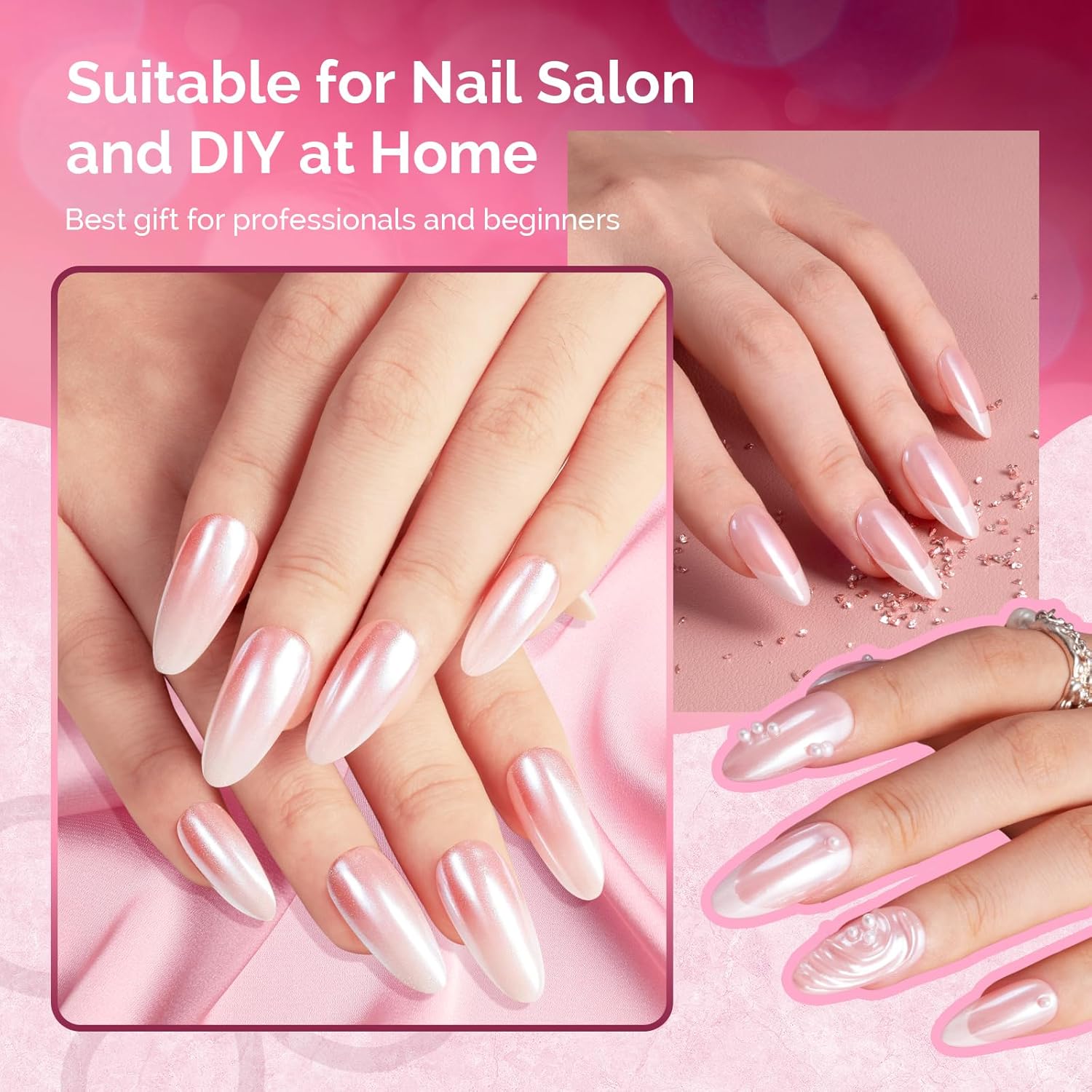 - White Pearl Chrome Nail Powder: Chrome nail powder has a very nice shiny mirror effect and can be used with different colors of gel nail polish to create different effects,just a little powder and your nail will be different