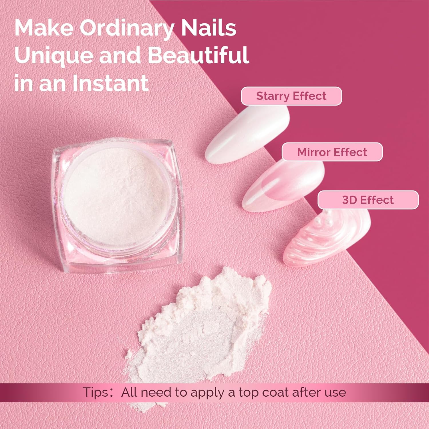 - Wide Range of Applications: Suitable for UV gel nails,acrylic nails,natural nails or false nails.Easy to get a salon grade chrome effect without special techniques.Powder is easy to apply and suitable for beginners