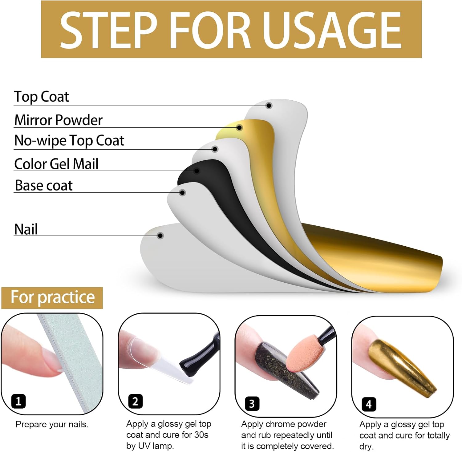 - PACKAGE CONTENTS:1 PCS chrome nail mirror pigment powders. It needs to be used with gel nail polish and no wipe top coat. They can make many different design for your gel nail polish. It gives different color base a pearly shine for your nails