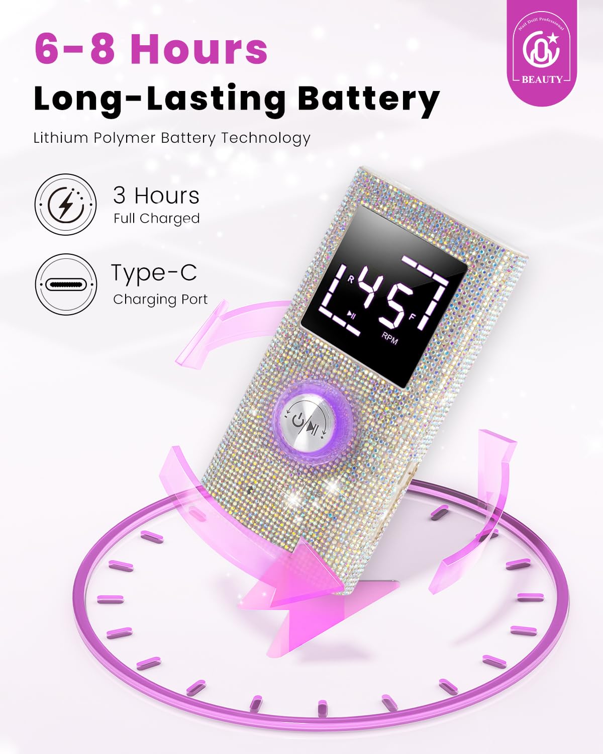- ๐๐ผ๐ป๐ด-๐๐ฎ๐๐๐ถ๐ป๐ด ๐๐ฎ๐๐๐ฒ๐ฟ๐ ๐๐ถ๐ณ๐ฒ๏ผEquipped with a high-capacity battery, this nail drill offers long-lasting performance, reducing the need for frequent recharging. It charges fully in just 3 hours and provides up to 8 hours of use, making it ideal for both home and salon use. The battery ensures you can complete your manicure or pedicure without interruptions, giving you more time to focus on your work.