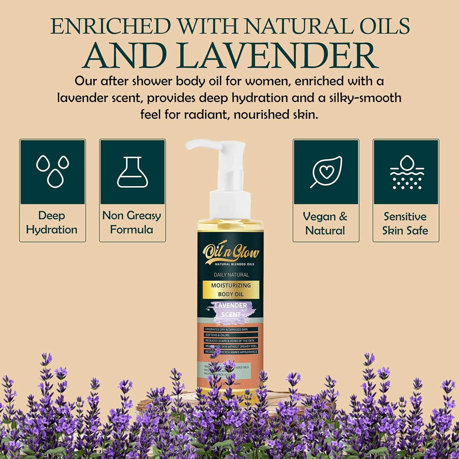 - FREE FROM HARSH CHEMICALS: Our lavender body oil is crafted without parabens, phthalates, artificial fragrances, or harsh chemicals, making it an ideal body oil for women and men with sensitive skin. Powered by nature, this nontoxic, non-comedogenic solution is packed with nutrient-rich oils like body coconut oil, bio oil for scars, and almond body oil. Experience pure hydration with a body oil non greasy finish that respects your skin’s balance and leaves you feeling confident every day.