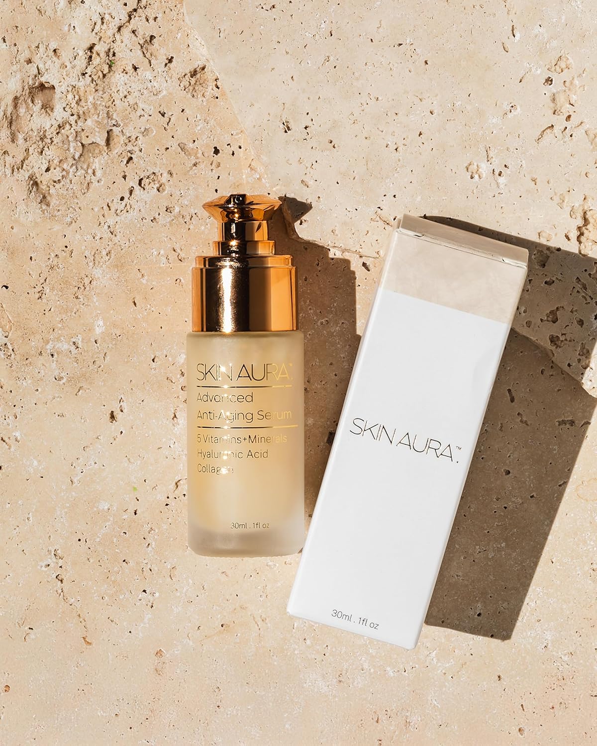SKIN AURA Advanced Anti-Aging Serum - All-In-One Formula Visibly Improves Wrinkles, Fine Lines & Age Spots with 5 Vitamins + Minerals, Hyaluronic Acid & Collagen Peptides - 30ml (1oz)