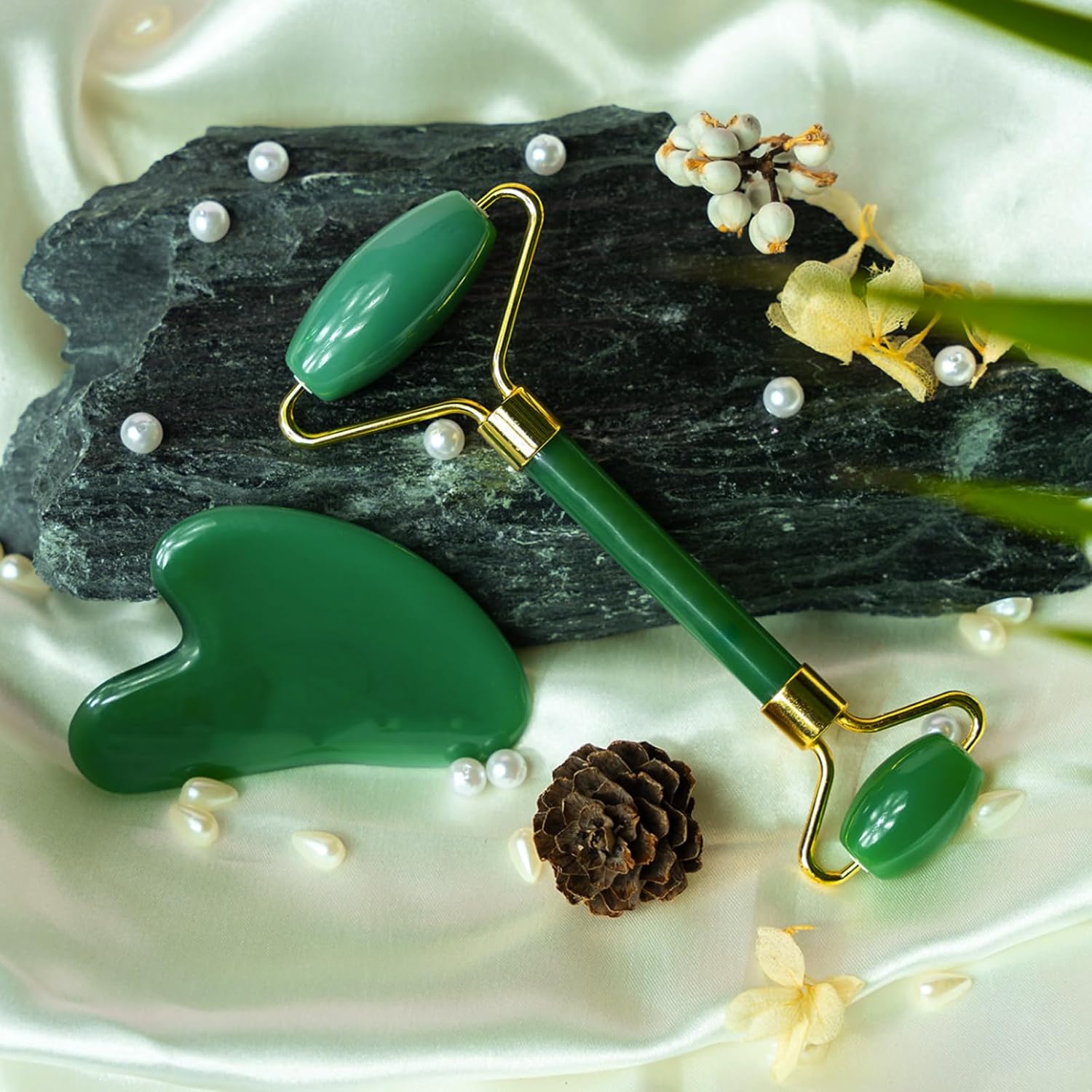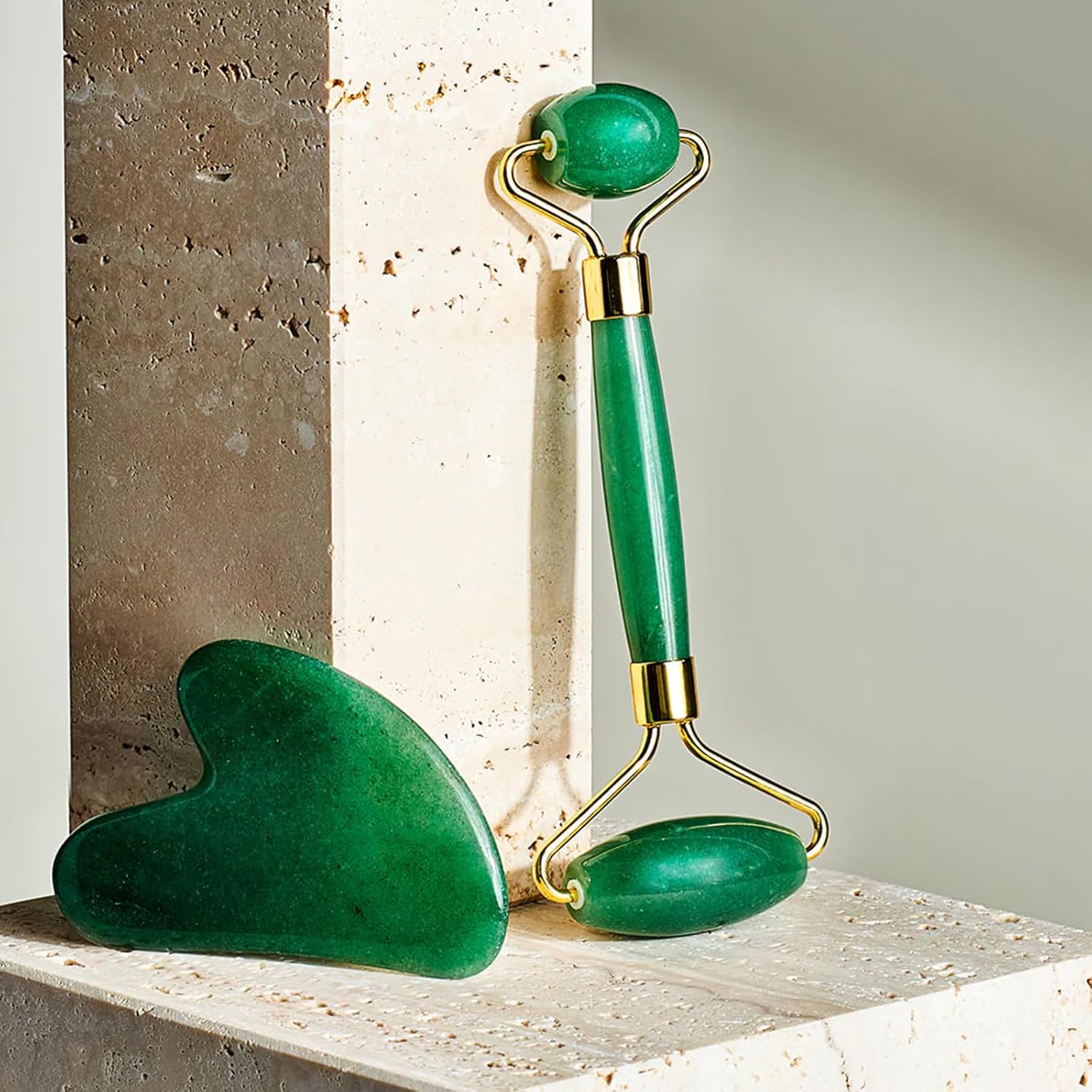 - 2-in-1 Skincare Set – Includes a facial roller for gentle massage and a Gua Sha board for deeper contouring, improving skin elasticity and reducing the appearance of fine lines.