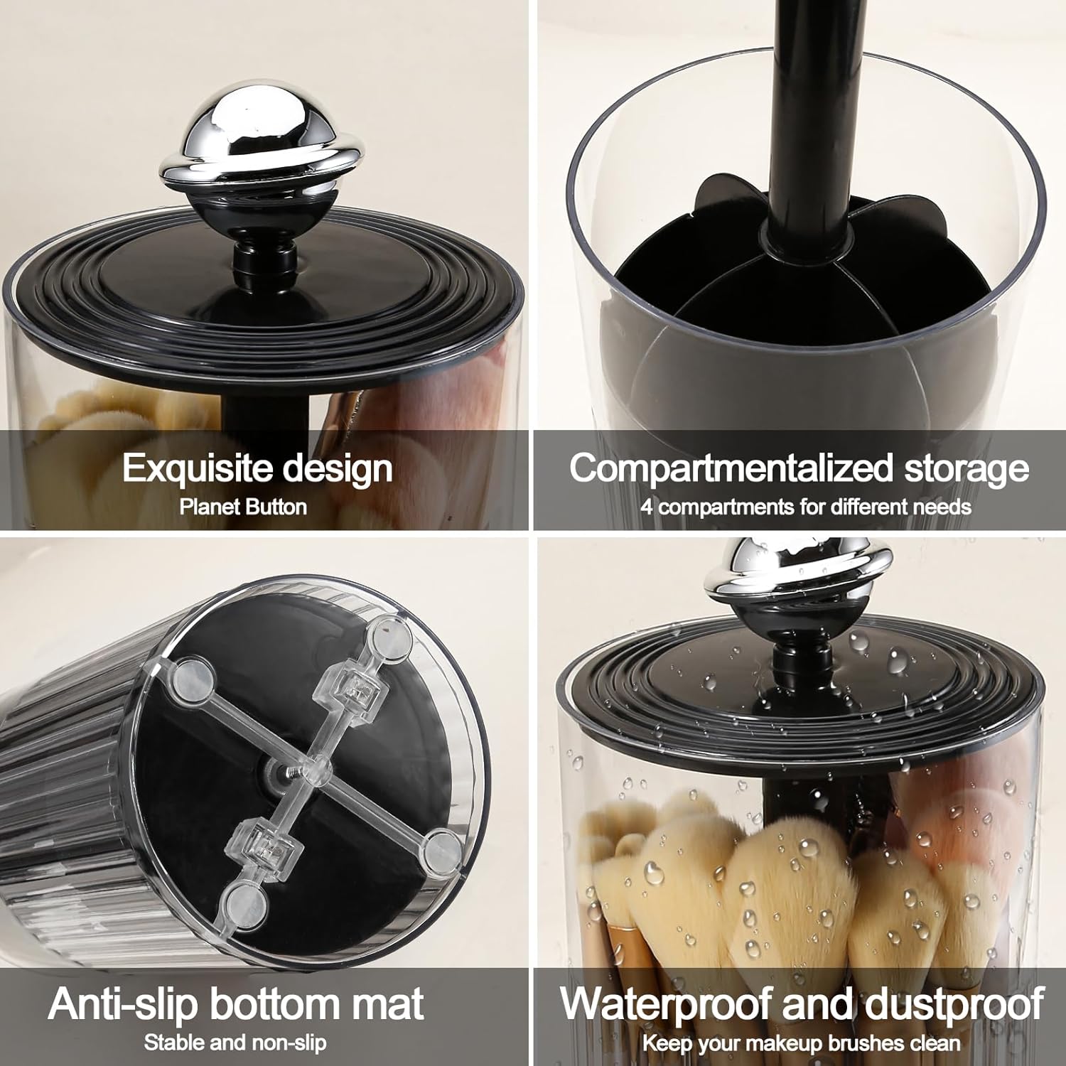 DASITON Makeup Brush Holder with Lid, Automatic Lifting Makeup Organizer for Vanity, 4 Slots Clear Makeup Brush Organizer, Dustproof Cosmetic Brushes Storage for Bathroom, Desktop, Office (Black)