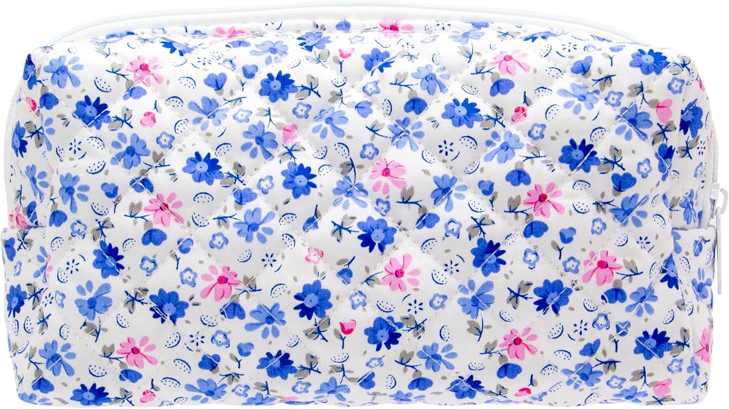 PAZIMIIK Vintage Quilted Makeup Bag Cosmetic Pouch for Brushes Pencils and Travel Make Up Accessories for Women and Girls Flower Blue