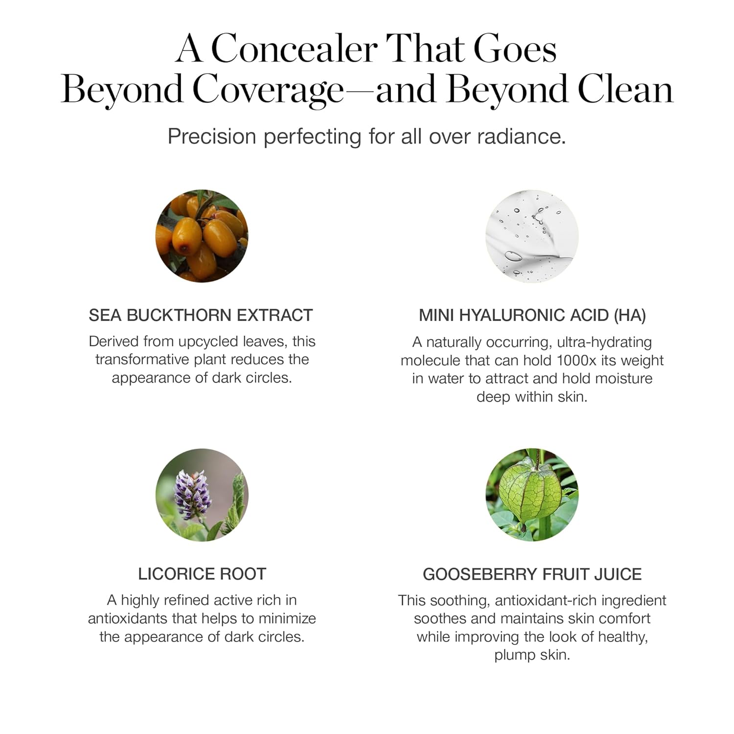 - Certified Organic: The eye concealer for dark circles is powered by high-performance ingredients like Sea Buckthorn Extract, Licorice Root & Hyaluronic Acid. Certified Organic, Cruelty-Free & Made in the USA.