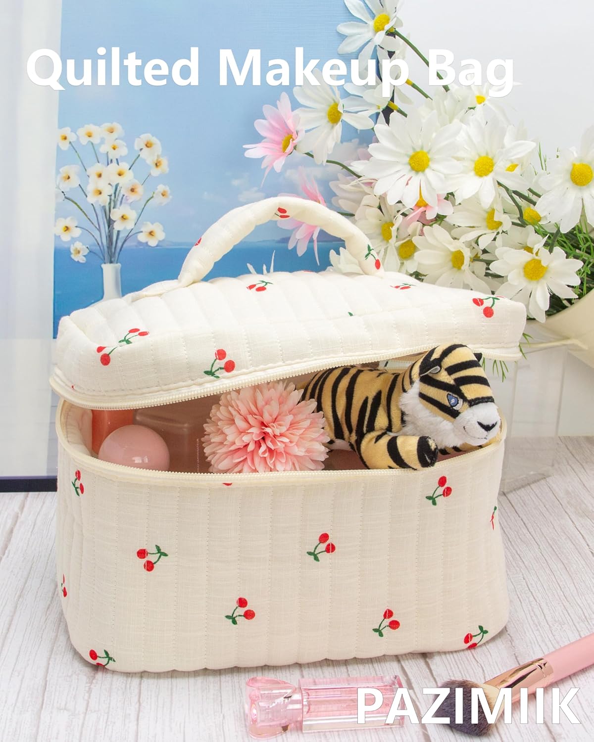 PAZIMIIK Quilted Makeup Bag Large Travel Zipper Soft Cosmetic Case for Women Girls Make Up,Cherry Beige