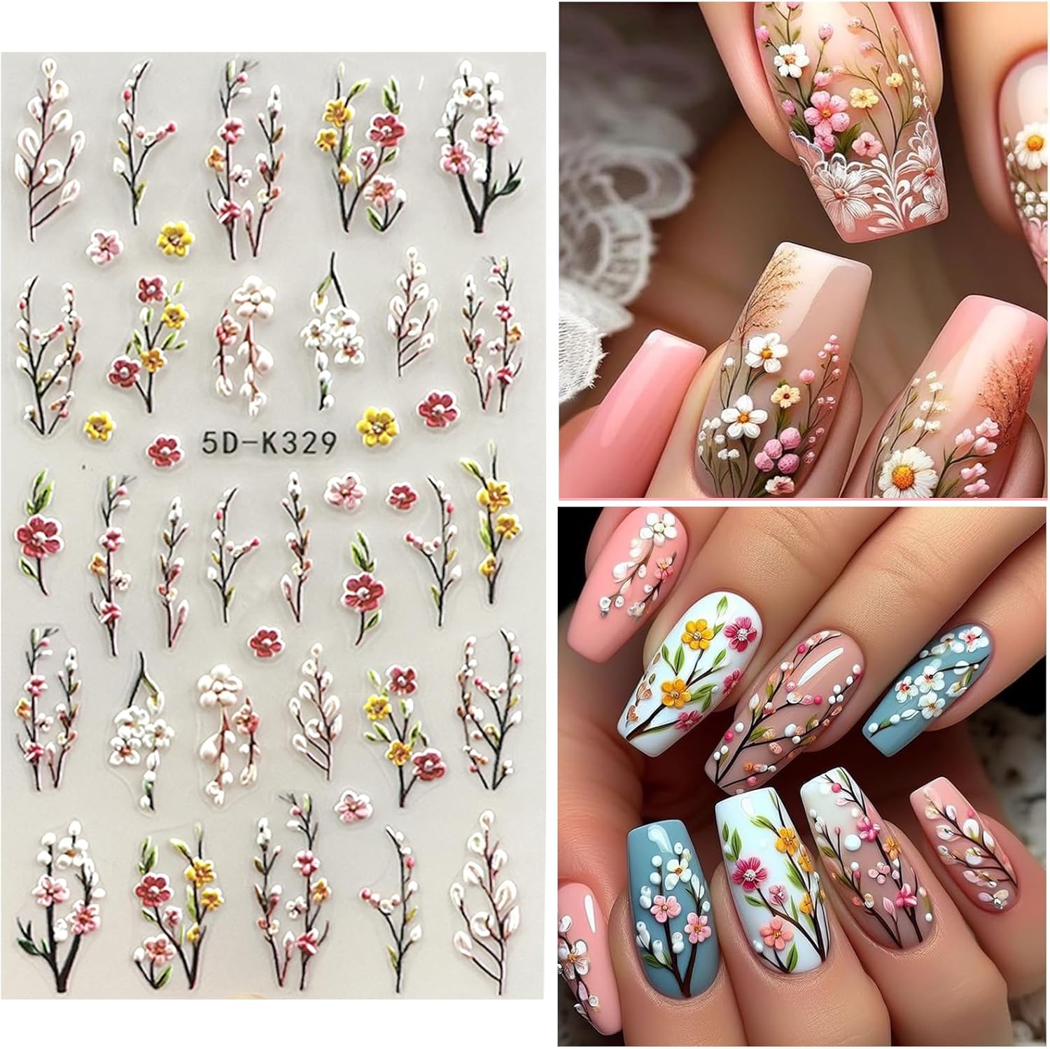 Spring Flower Nail Art Stickers Decals Floral Nail Decals Self Adhesive 5D Embossed for Women Nails Design Decoraion Colorful Rose Plum Blossom 3D Flower Mails Stickers Supplies