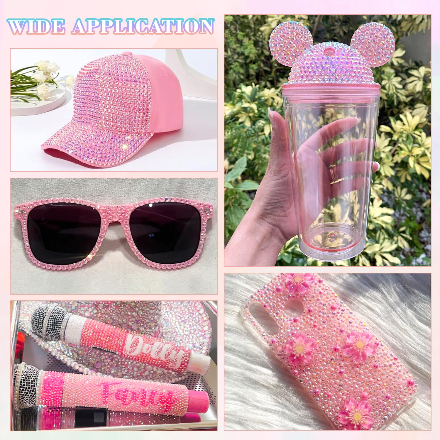 - PACKAGE CONTENT – This all-in-one bedazzler kit includes everything you need to start creating dazzling designs: 1 box of Light Pink AB rhinestones with 24 grids (approx. 30,000 pcs of bedazzling rhinestones assorted size SS6/10/16/20/30 ), 1 precision tweezers, 1 pickup pen for handling small gems, and 3 tubes of B7000 jewelry glue for secure application.