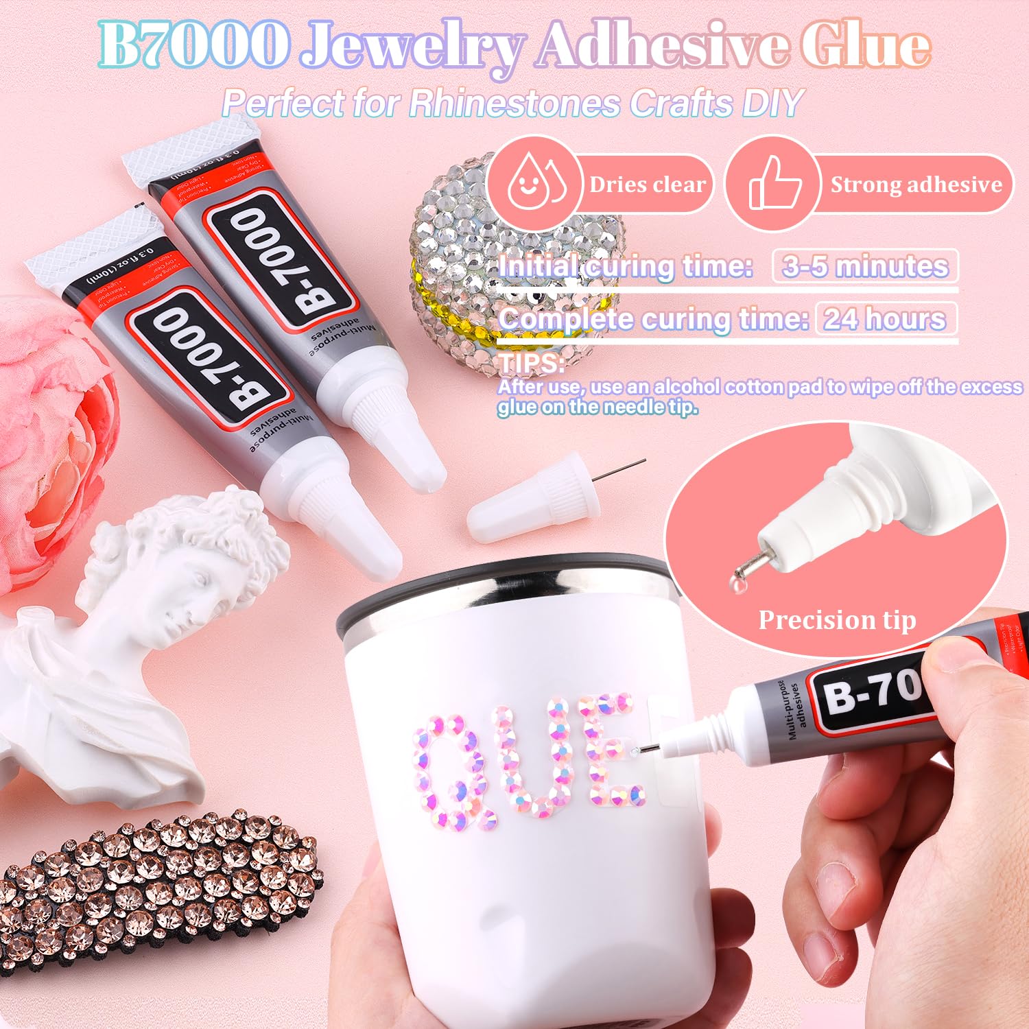 - STRONG B7000 GLUE FOR GEMS – B7000 glue offers strong, long-lasting adhesion and dries clear, making it perfect for securing gemstones and other embellishments. The precision needle tip allows for controlled, mess-free application. For best results, clean the needle with an alcohol wipe after each use to prevent clogging and ensure smooth flow every time.