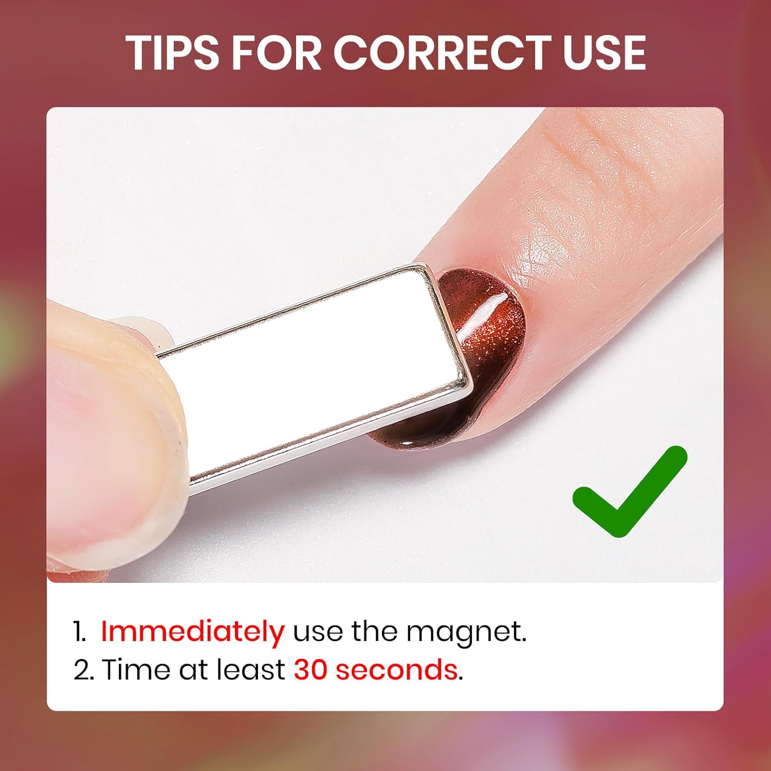 - Important Tips: 1. When the nail polish is not dry yet, it will be fluid. Use magnets to hold it in place until it's semi-dry, then take them off for a sharp cat-eye look 2. Do not touch water or hit the nail surface within two hours after finishing to avoid peeling; 3. Base and top coat nail polish art necessary