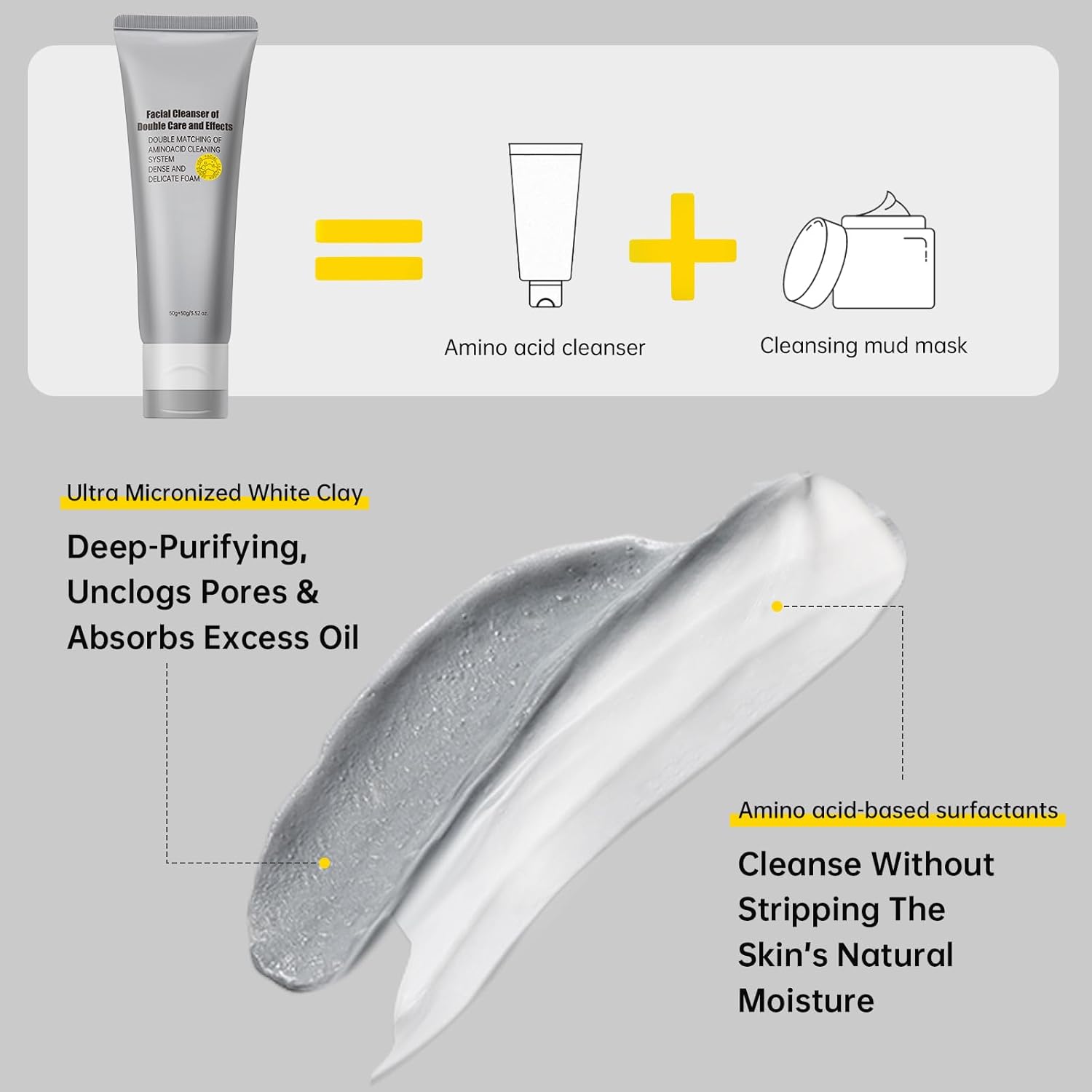 - 【Double Tube Design】This daily facial cleanser combines desalinated amino acids with micronized white clay in a dual-action formula—gently purifying pores with effective cleansing power while maintaining skin’s natural moisture barrier for a non-irritating finish