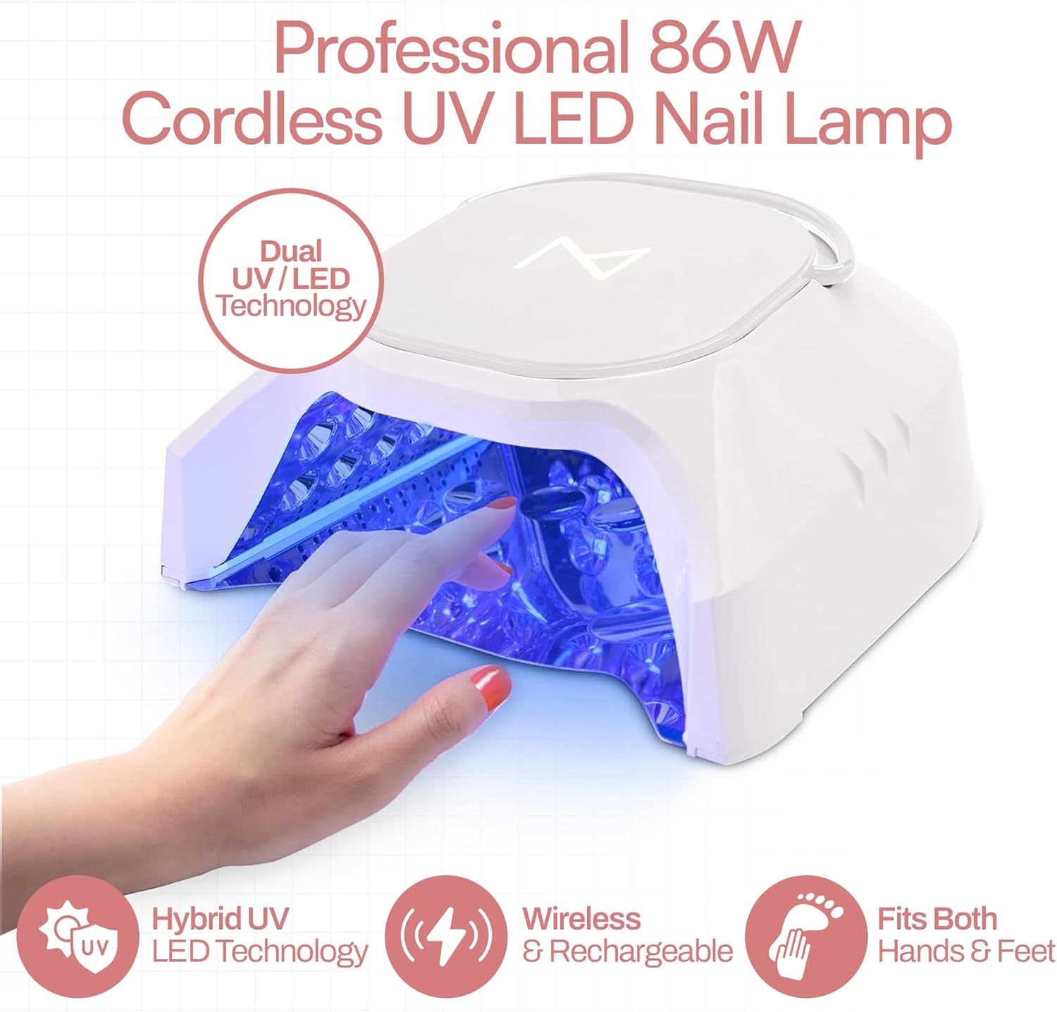 M - GlowPro Professional Hybrid 86W Wireless Rechargeable UV LED Nail Curing Lamp Cordless Nail Dryer for Gel Nails, Manicure, Pedicure (Pink)
