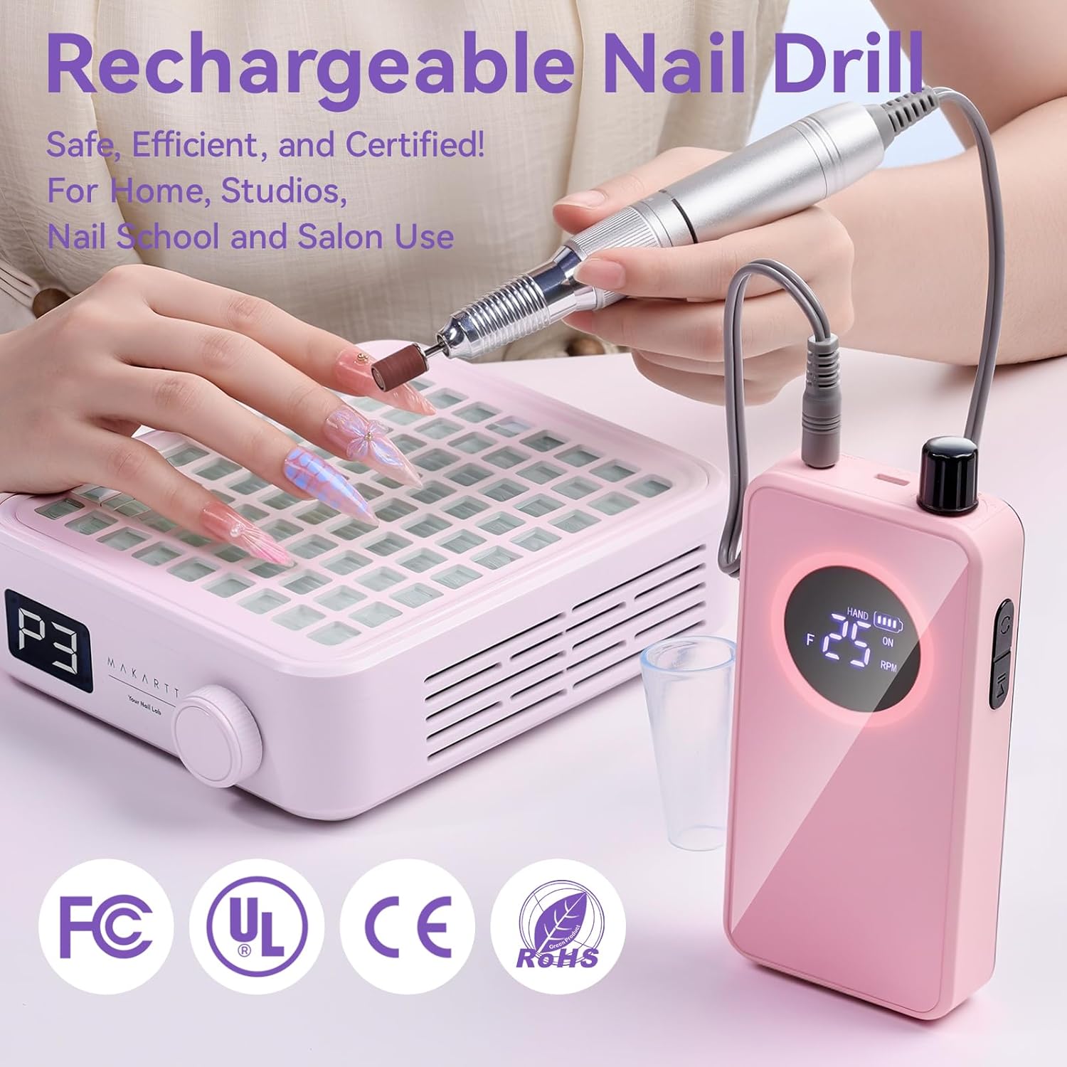 - Powerful 35,000RPM Motor: The Makartt pink electric nail drill delivers salon-level power with adjustable speed and forward/reverse rotation. Easily files, shapes, buffs, and removes for natural and hard gel nails—perfect for home or pro use