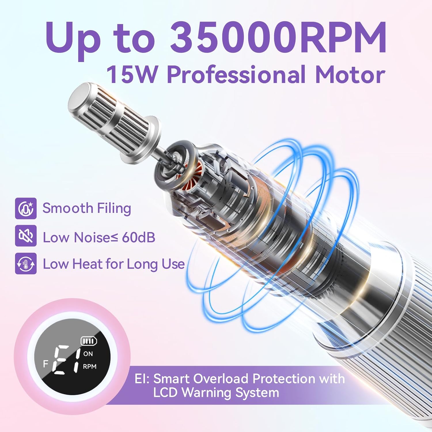 - Smart LCD with RPM Color Ring: This drill for nails features a bright LCD that shows speed, battery level, F/R direction and charging status. 4 color ring lights (Green, Blue, Red, White) indicate speed range. The nail grinder offers smooth and stepless adjustment up to 35,000 RPM