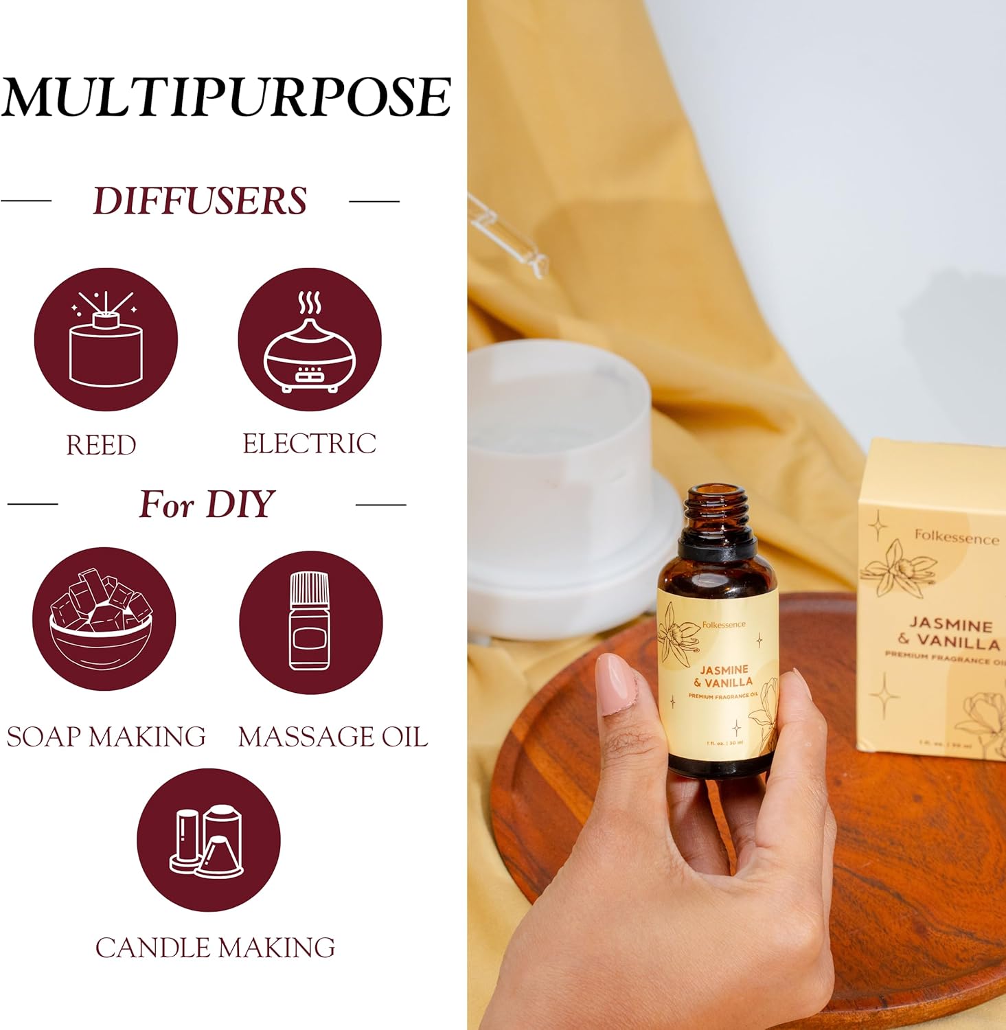 Folkulture Premium Essential Oil Blends for Diffuser for Home | 1.01 Fl Oz Vanilla Essential Oils for Aromatherapy | Jasmine Fragrance Oils for Soap & Candle Making Scents | Diffuser Oil for Massage